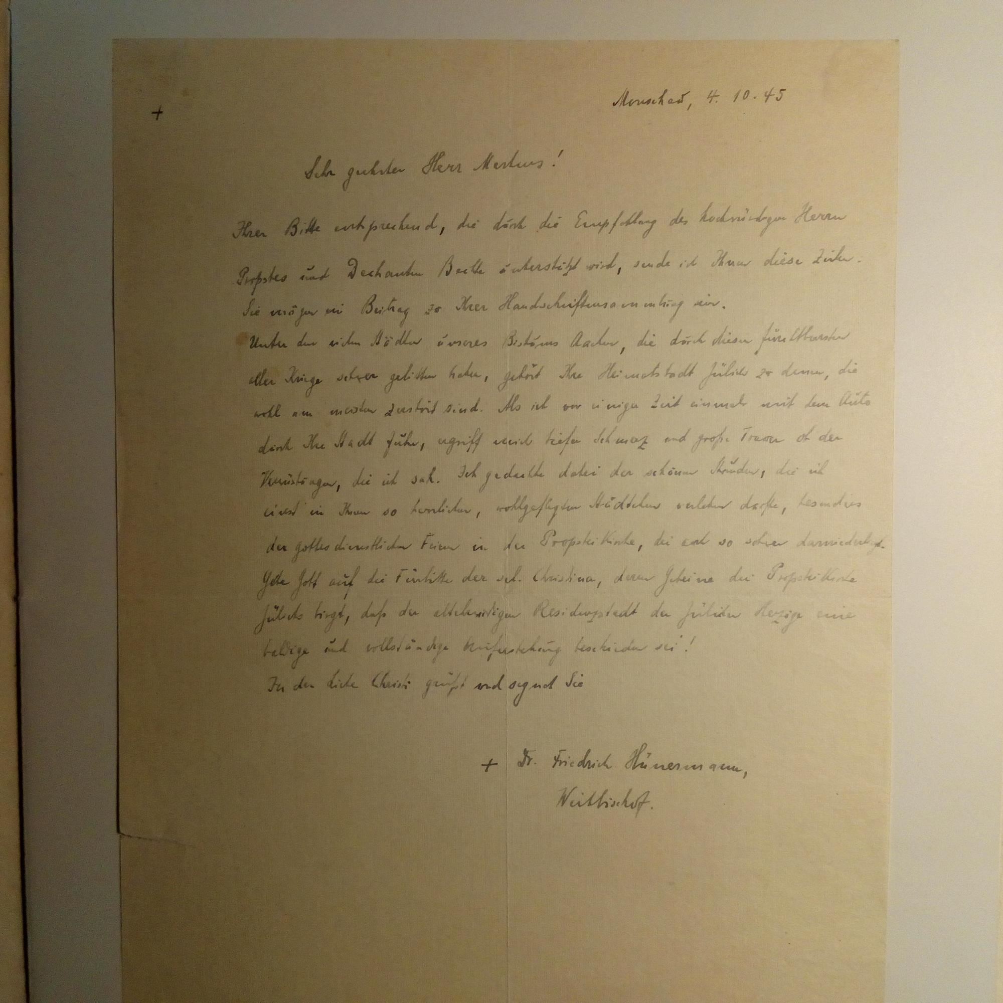 1886-1969, Weihbischof von Aachen - E. Br. m. U., Monschau (Eifel) 4.10.1945, ¾ S. 4°, kl. Schrift. An einen Sammler: ...Als ich vor einiger Zeit einmal mit dem Auto durch die Stadt fuhr, ergriff mich tiefer Schmerz und große Trauer ob der Verwüstungen... Montiert zus. m. vielen Presseartikeln in Folio-Mappe.