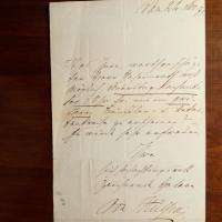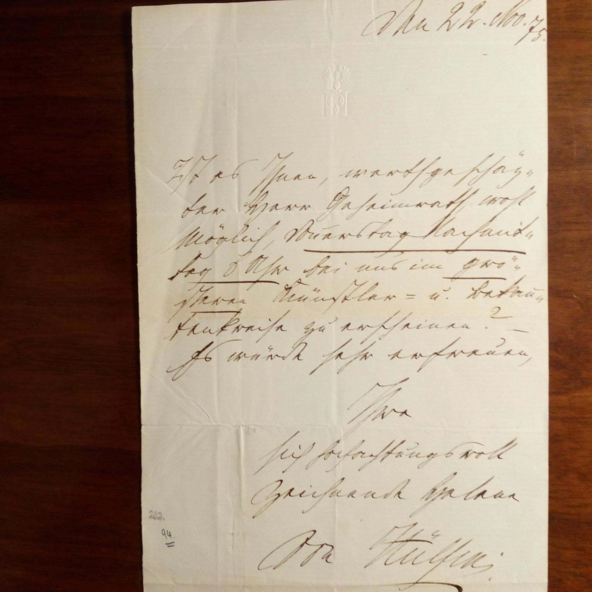 geb. Gräfin von Haeseler, 1829-92, Schrift-stellerin und Salonnière, Gattin des Intendanten der kgl. Theater in Berlin, Botho von H. - E. Br. m. U., 22.11.1875, 1 S. 8°, gepr. Wappen am Kopf, Faltspuren. Lädt einen "Geheimrath" ein, "Donnerstag Nachmittag 6 Uhr bei mir im größeren Künstler- und Bekanntenkreise zu erscheinen...".
