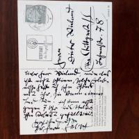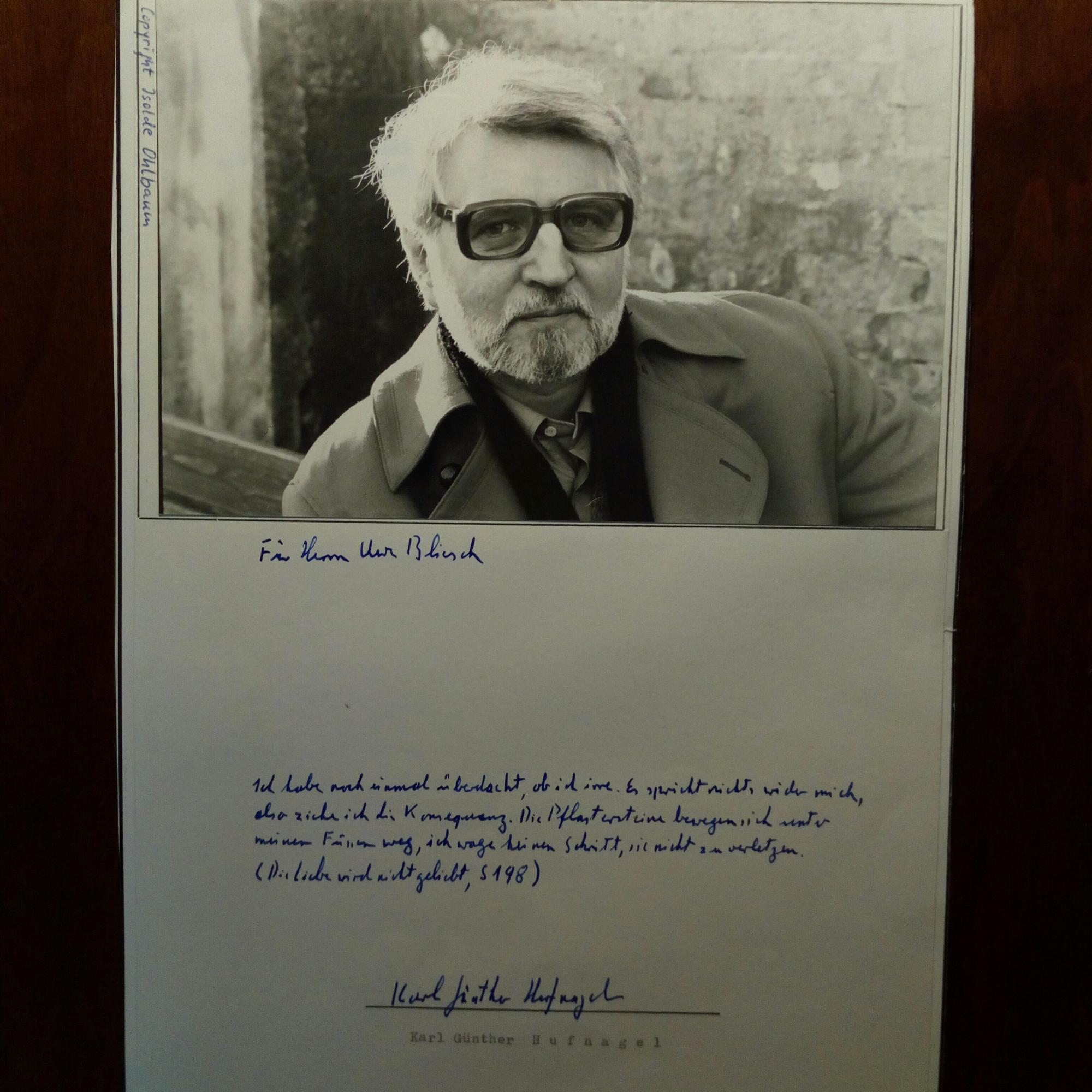1928-2004, Schriftsteller - E. Zitat (3 Z. aus "Die Liebe wird nicht geliebt. S. 198"), Widm. und U. unter auf 4° mont. Pfo. (Hochglanz, ca. 8° quer, von Isolde Ohlbaum).
