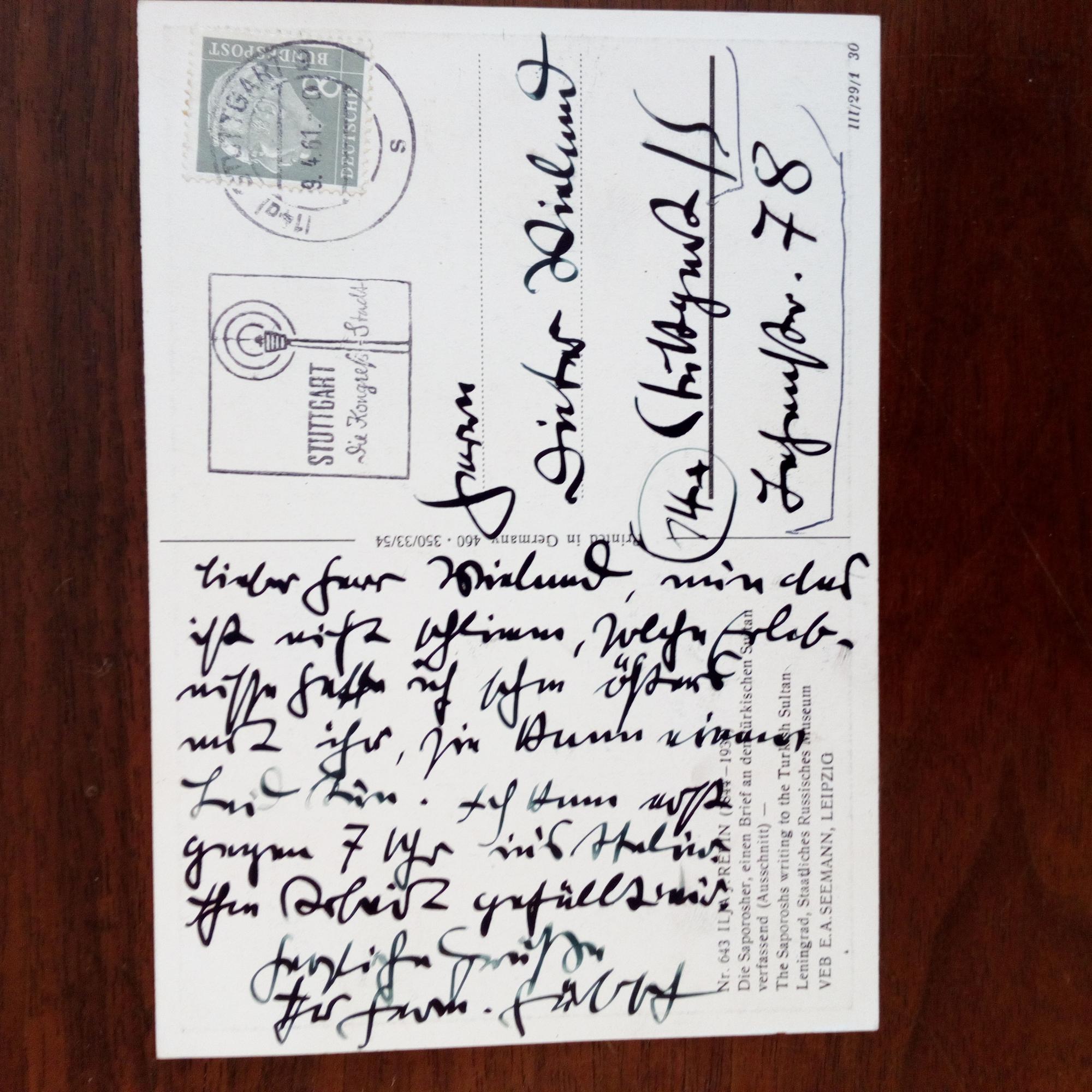1901-95, Maler - E. postal. Ansichtskarte (nach einem Gemälde von Ilja J. Befin) mit U., (Stuttgart 9.4.1961). An Dieter Wieland in Stuttgart: ...ist nicht schlimm. Solche Erlebnisse hatte ich schon öfter mit ihr...muß noch gegen 7 Uhr ins Atelier. Ihre Arbeit gefällt mir...
