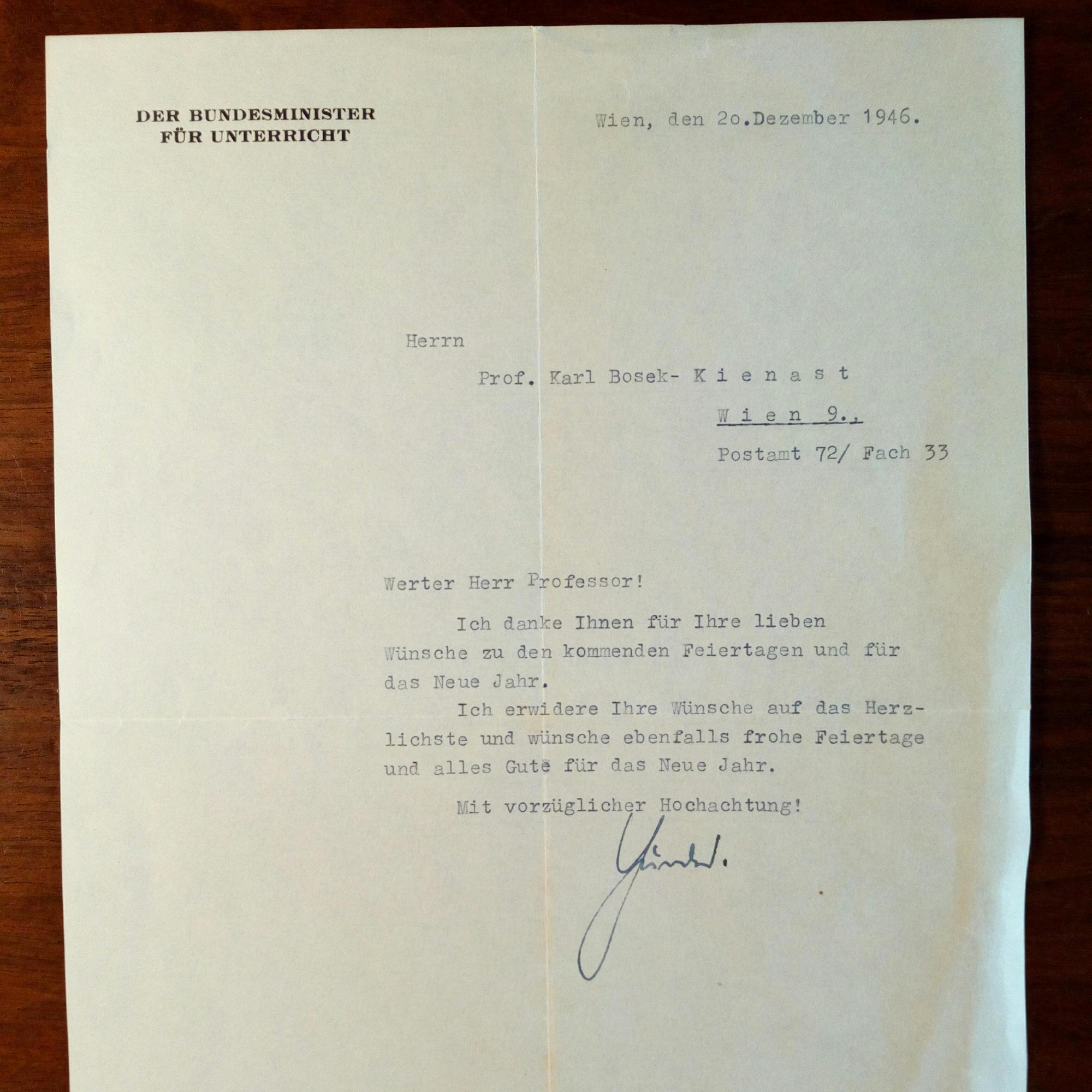 1901-74, österr. Jurist und Politiker, KZ-Überlebender - Br. mit U., Wien 20.12.1946, ¾ S. 4°, Br.kopf als Minister für Unterricht. Mit postal. Umschlag. An den Lehrer und völk. Schriftsteller Karl Bosek-Kienast (1895-1983) in Wien: Erwidert Neujahrswünsche.