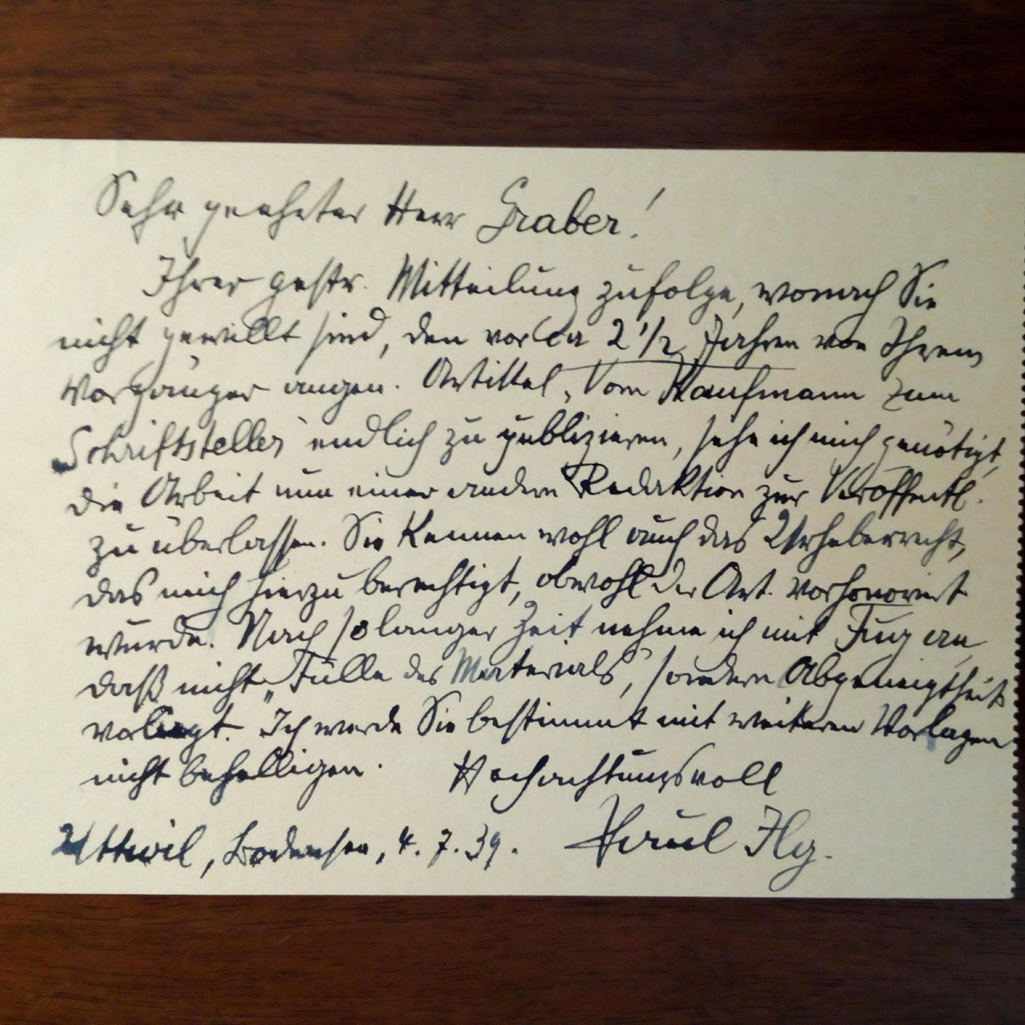1875-1957, schweiz. Schriftsteller - E. postal. Postkarte mit U., Uttwil (am Bodensee) 4.7.1939. An den Redakteur der "Neuen Schweizer Bibliothek", Graber: Hat seinen Artikel "Vom Kaufmann zum Schriftsteller" inzwischen einer anderen Redaktion zur Veröffentlichung überlassen. ...werde Sie bestimmt mit weiteren Vorlagen nicht behelligen... Beiliegt 4°-Blatt mit schönem e. Gedicht ("Die Uhr", 2 Str. à 4 Z.) und U.