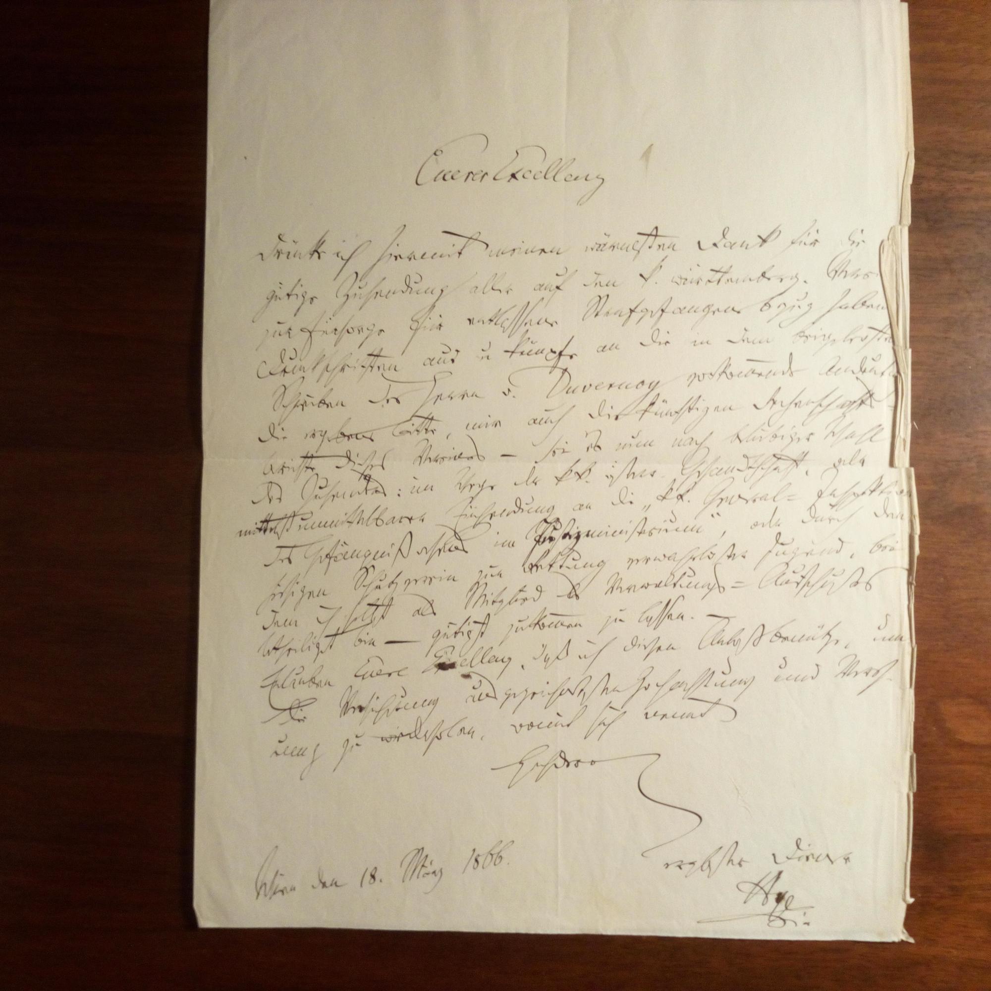 1807-94, österr. Justizmin. - E. Br. m. U., Wien 18.3.1866, 1 S. gr. 4°, rechter Rand beschäd. Energisch u. ironisch betr. eines "Staatsgefangenen". Erw. den Juristen Gustav von Duvernoy (1802-90).