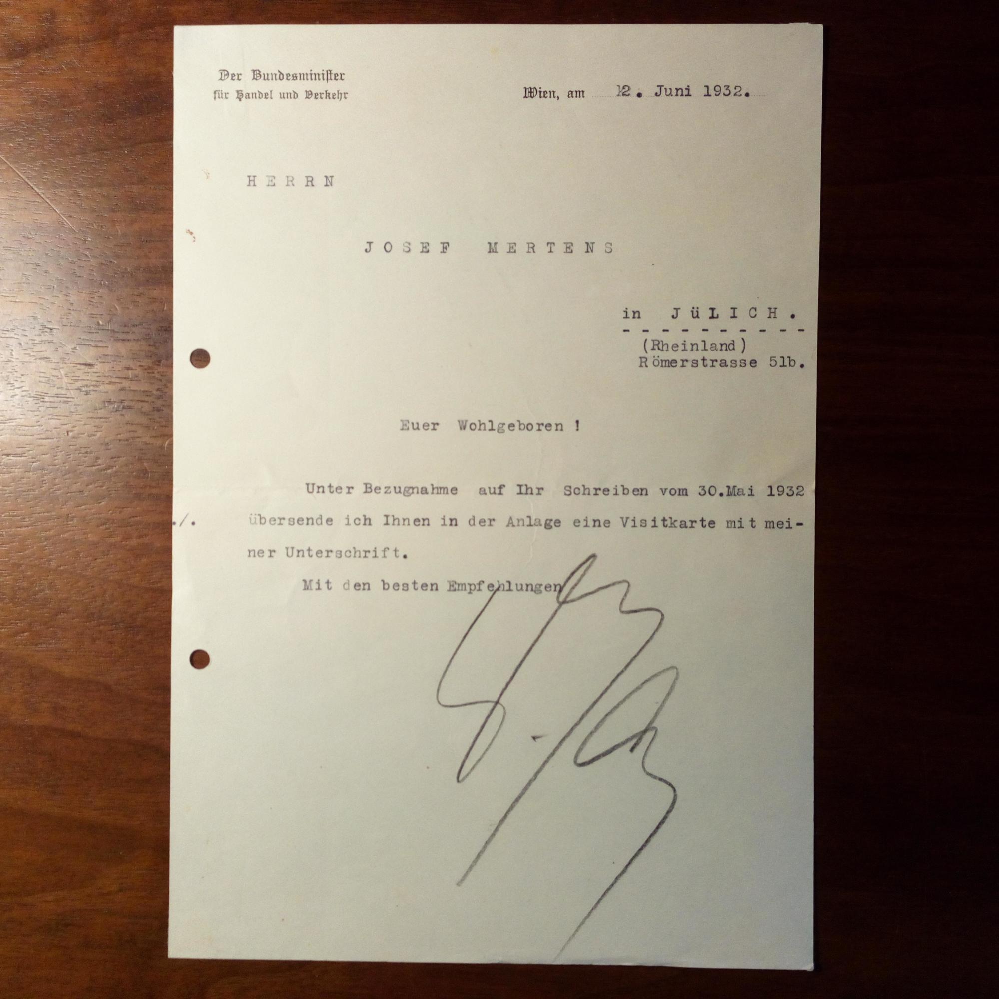 1895-1972, österr. Politiker - Visitenkarte (als Min. für Handel und Verkehr) mit U. auf Rückseite. Dazu Begleitbrief mit U., (Wien) 12.6.1932, 1 S. gr. 8°, Briefkopf, gel. An den Diplomaten Josef Mertens (1865-1934) in Jülich. Dazu ähnl. an dens., 18.6.1932: ...ersuche ich Sie von der Veröffenlichung meiner Handschrift Abstand zu nehmen...