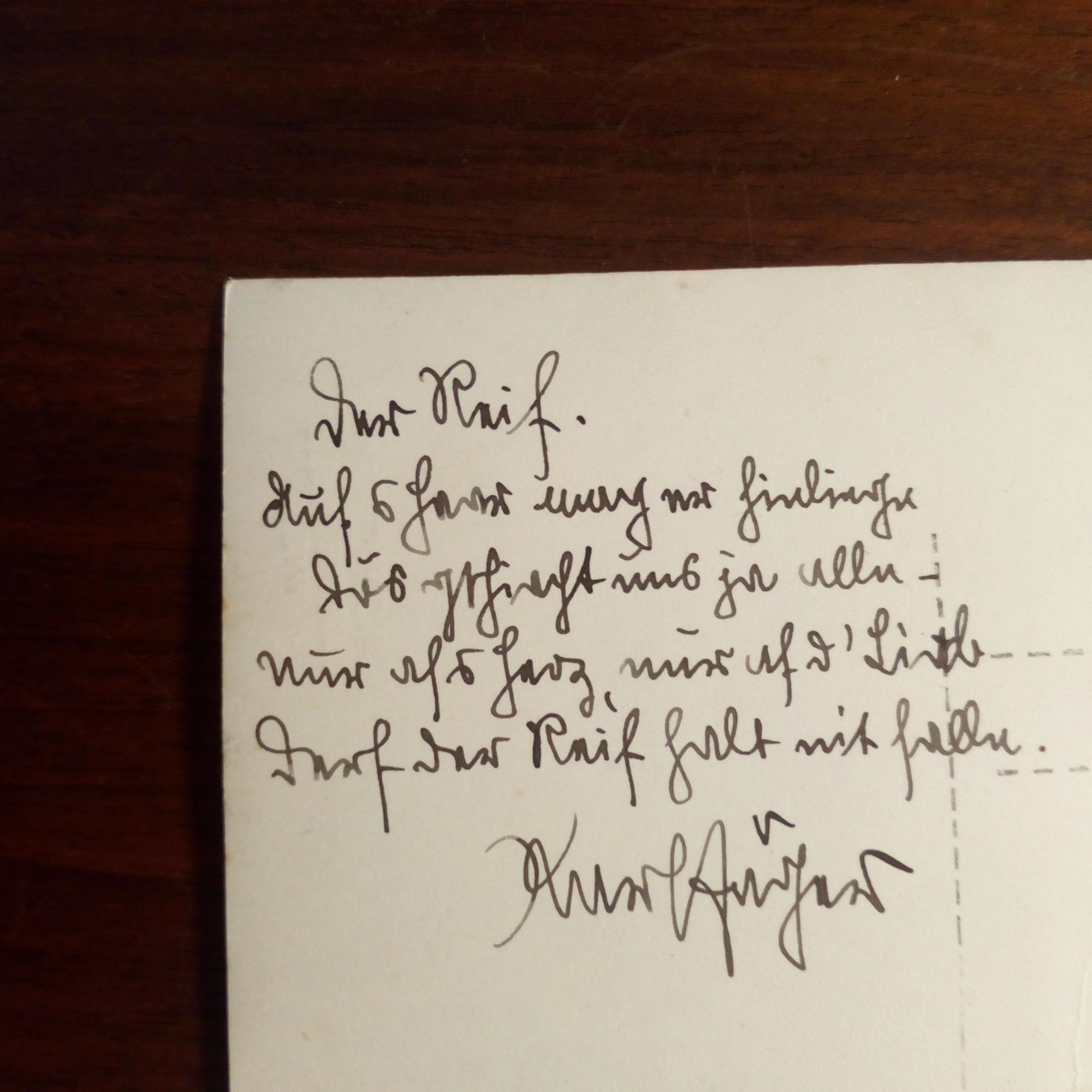 1871-1960, Wiener Sänger und Mundart-Dichter, Direktor der "Urania" (Sternwarte und Volksbildungswerk) - Pfo. (20er Jahre) mit e. Gedicht ("Der Reif", 4 Z.) mit U., auf Rückseite (Mont.spuren).