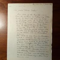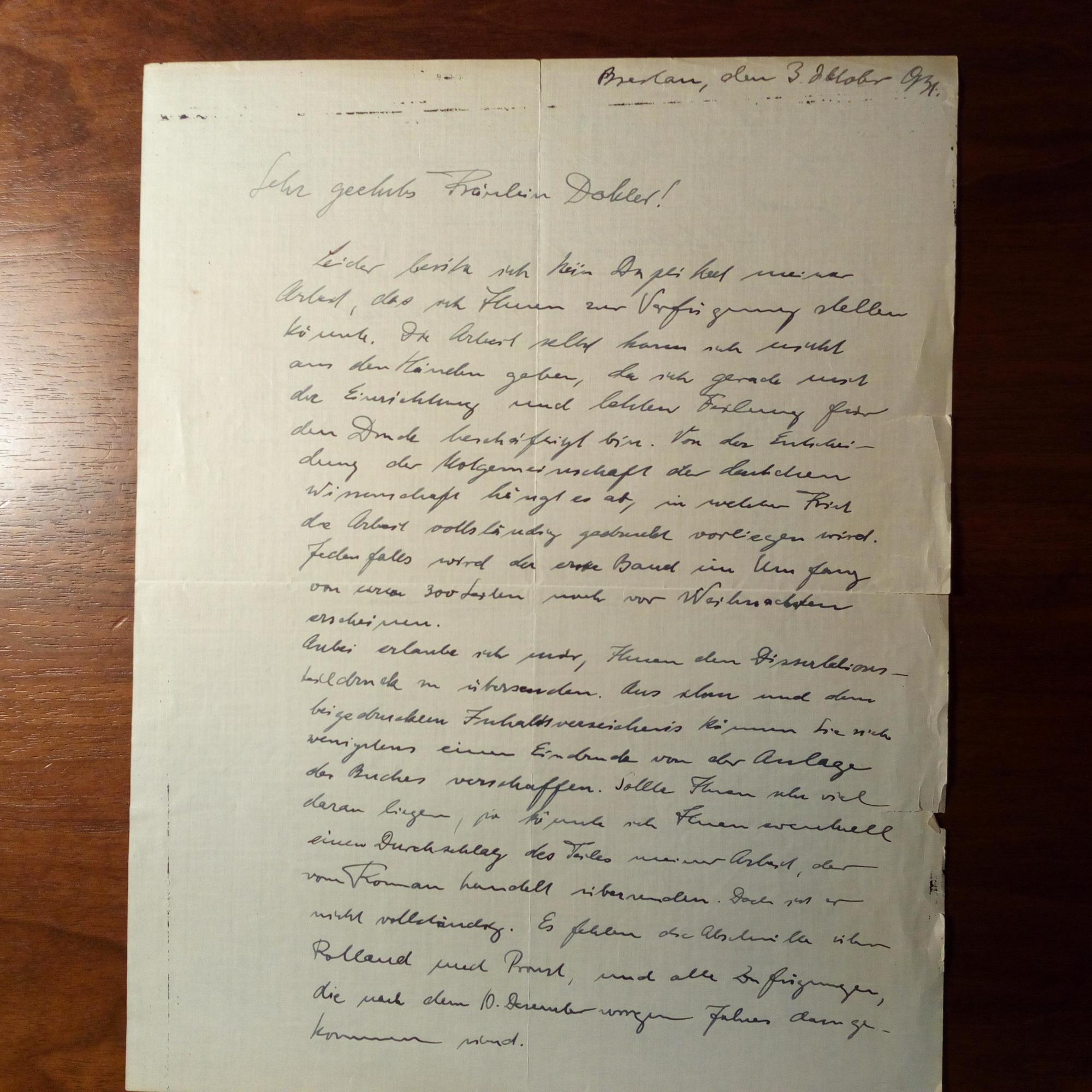 1904-37, Romanist - E. Brief mit U., Breslau 3.10.1934, 1 ¼ S. 4°, kl. Schrift, ger. Altersspuren. An eine Dame, die um ein Duplikat seines neuen Werkes gebeten hatte: ...kann ich nicht aus den Händen geben, da ich gerade mit der Einrichtung und den letzten Feilungen für den Druck beschäftigt bin...fehlen die Abschnitte über Rolland und Proust...