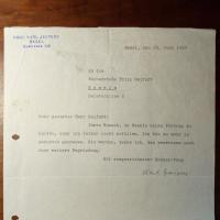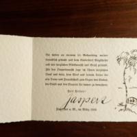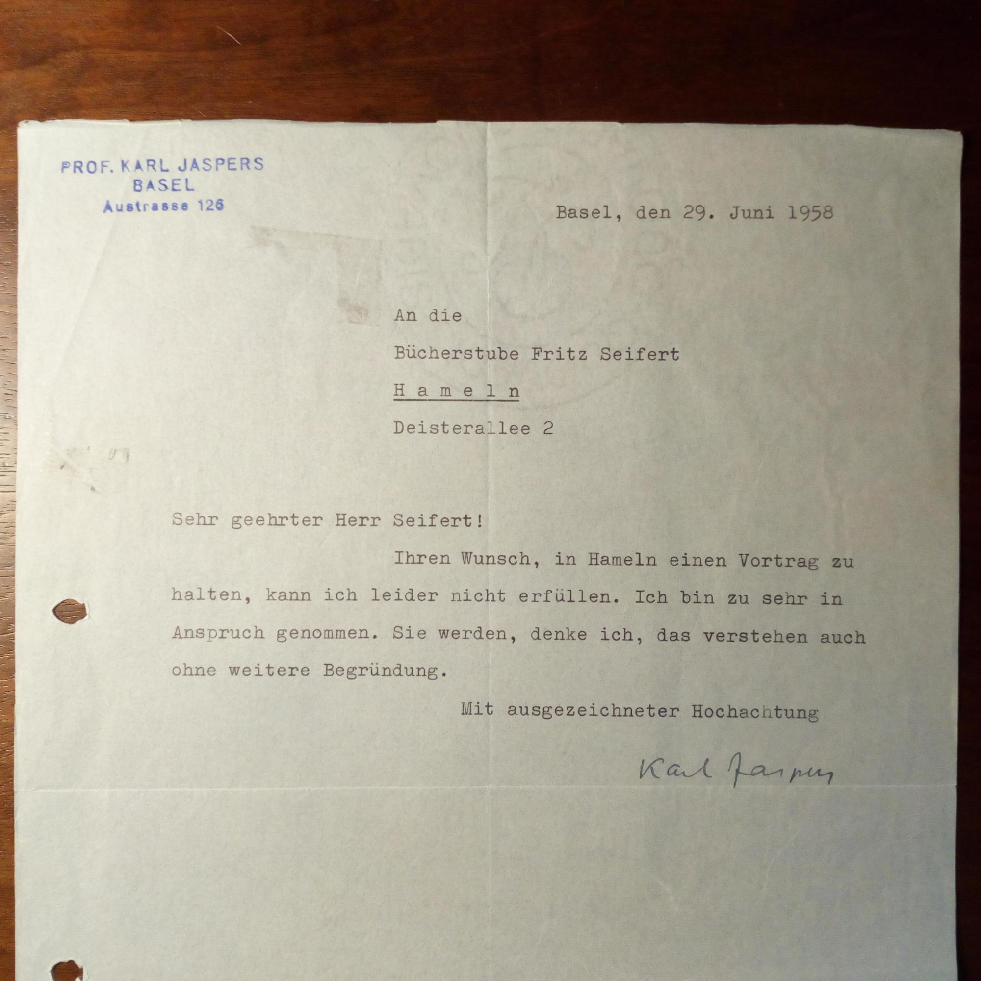 1833-1969, Philosoph - Brief mit U., Basel 29.6.1956, ½ S. 4°, Abs.stempel. An Buchhändler Fritz Seifert (1902-90) in Hameln betr. Anfrage für einen Vortrag: ...bin zu sehr in Anspruch genommen... Beiliegt e. Begleitbrief mit U. zu anderem Jaspers-Brief, (Hannover) 2.6.1938, 2 S. 8°, des Theologen, Pädagogen und ehem. Politikers Hermann Schuster (1874-1965) in Hannover. Weitere kl. Beilage.