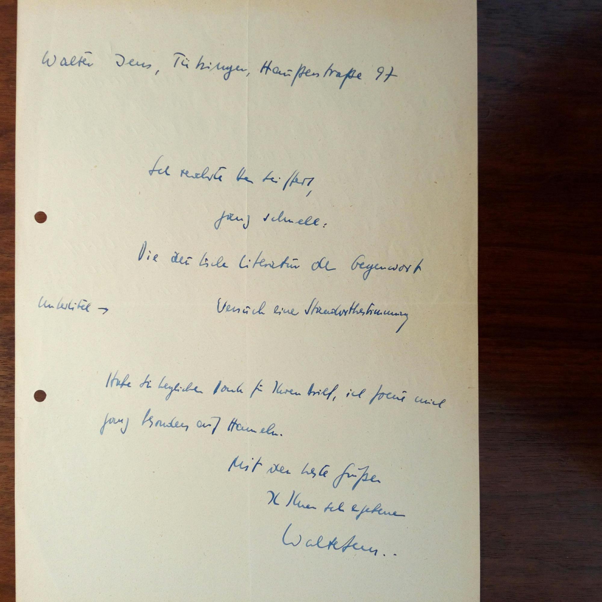 1923-2013, Literaturhistoriker und Prof. für Rhetorik - 1. E. Brief mit U., Tübingen 7.6.1984, 1 S. 4°. An Kroll: ...Einen Bloch-Text habe ich beim besten Willen nicht...werde ich aus meinem Antikriegs-Spiel "Der Untergang" lesen... 2. E. Kurzbrief mit U., Tübingen 22.6.1985, 1 S. 4°, mit e. postal. Umschlag (U. im Abs.). An den Pianisten und Musikwissenschafts-Verleger Wolfgang Seibold (geb. 1941) in Karlsbad: ...ja, ich will gern mitspielen. Montag 3.7. um 16,00 bei mir in der Wohnung... Beiliegen: Einverständniserklärung zur Veröffentlichung seiner auf Band gespr. Worte für eine Schulfunksendung (1.10.1992) und ein e. korrigiertes Typoskript, beides mit e. postal. Umschlag. Sowie Karte mit U. und e. Zitat.