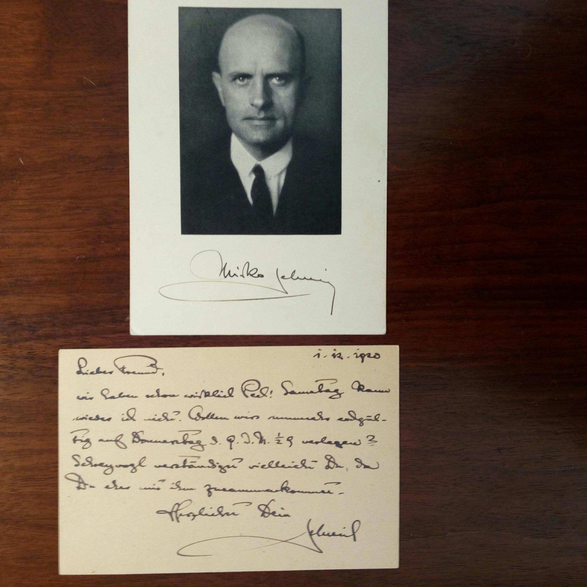 1886-1969, österr. Schriftsteller - E. postal. Postkarte mit U. ("Jelusich"), (Wien) 1.12.1920 und e. Brief mit U. ("Mirko") 28.12. 1920, 2 S. 8°. An den befreundeten österr. Schriftsteller Friedrich Wallisch (1890-1969) in Wien betr. eines geplanten Treffens von Kollegen. ...von dem "Drohbrief" weiß ich gar nichts. Sollte der junge Herr keck werden, bin ich dafür, daß wir ihn aufs energischste angehen... Beiliegen: Brief mit U. an denselben vom 20.6.1953: Sendet Liste von 8 Schriftstellern mit Adressen und dankt für die Bekanntschaft mit der "außerordentlich sympathischen Familie Bohmann" (Alfred, Journalist und Statistiker), sowie ein Pfo. mit U. von 1935.