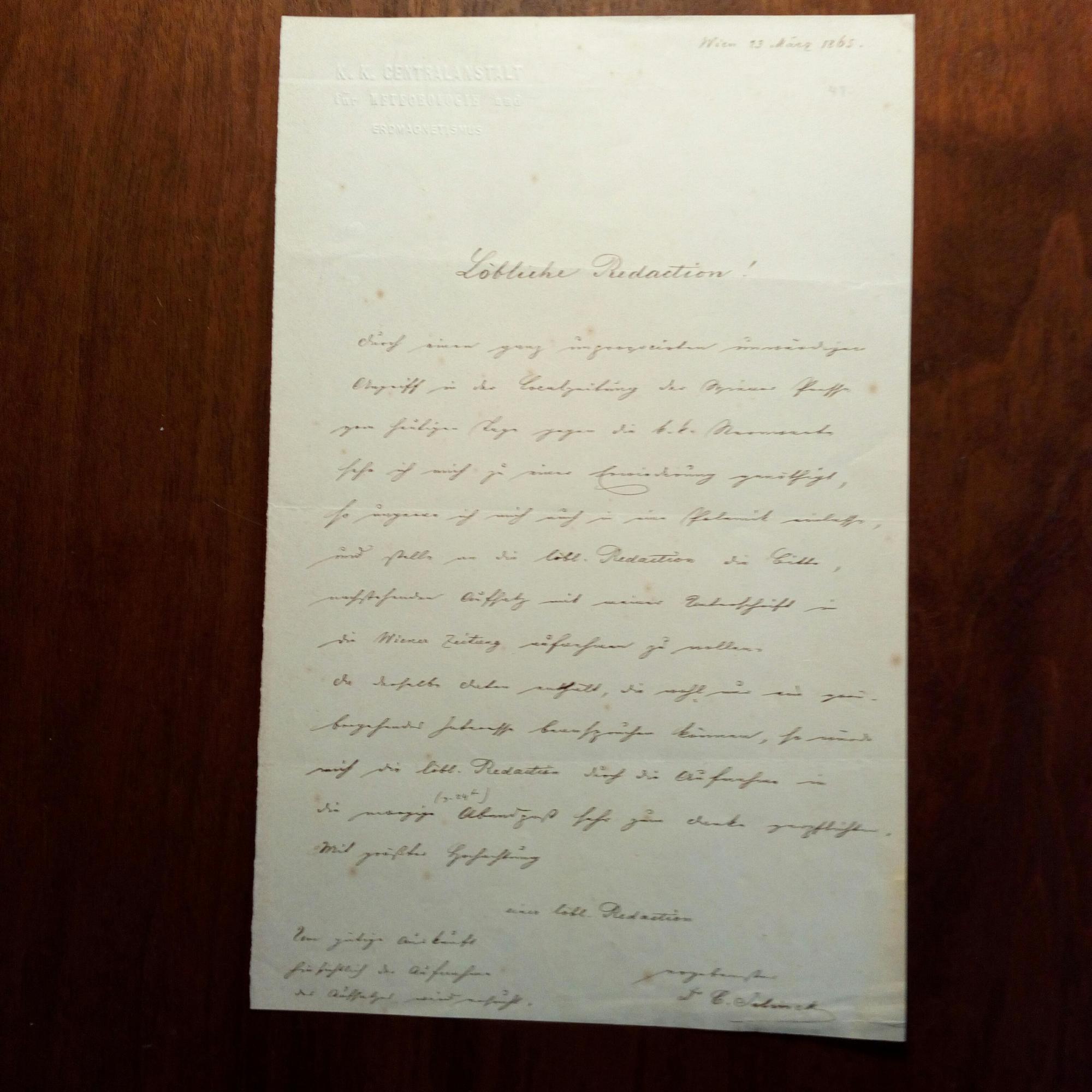 1822-76, österr. Meteorologe - E. Brief mit U., Wien 23.3.1865, 1 S. gr.8°, kl. Schrift, gepr. Br.kopf der "K.K. Centralanstalt für Meteorologie und Erdmagnetismus", minimale Gebr.spuren. An die Red. der "Wiener Zeitung": ...Durch einen ganz...unwürdigen Angriff in der Local-zeitung der Wiener Presse...sehe ich mich zu einer Erwiderung genöthigt...