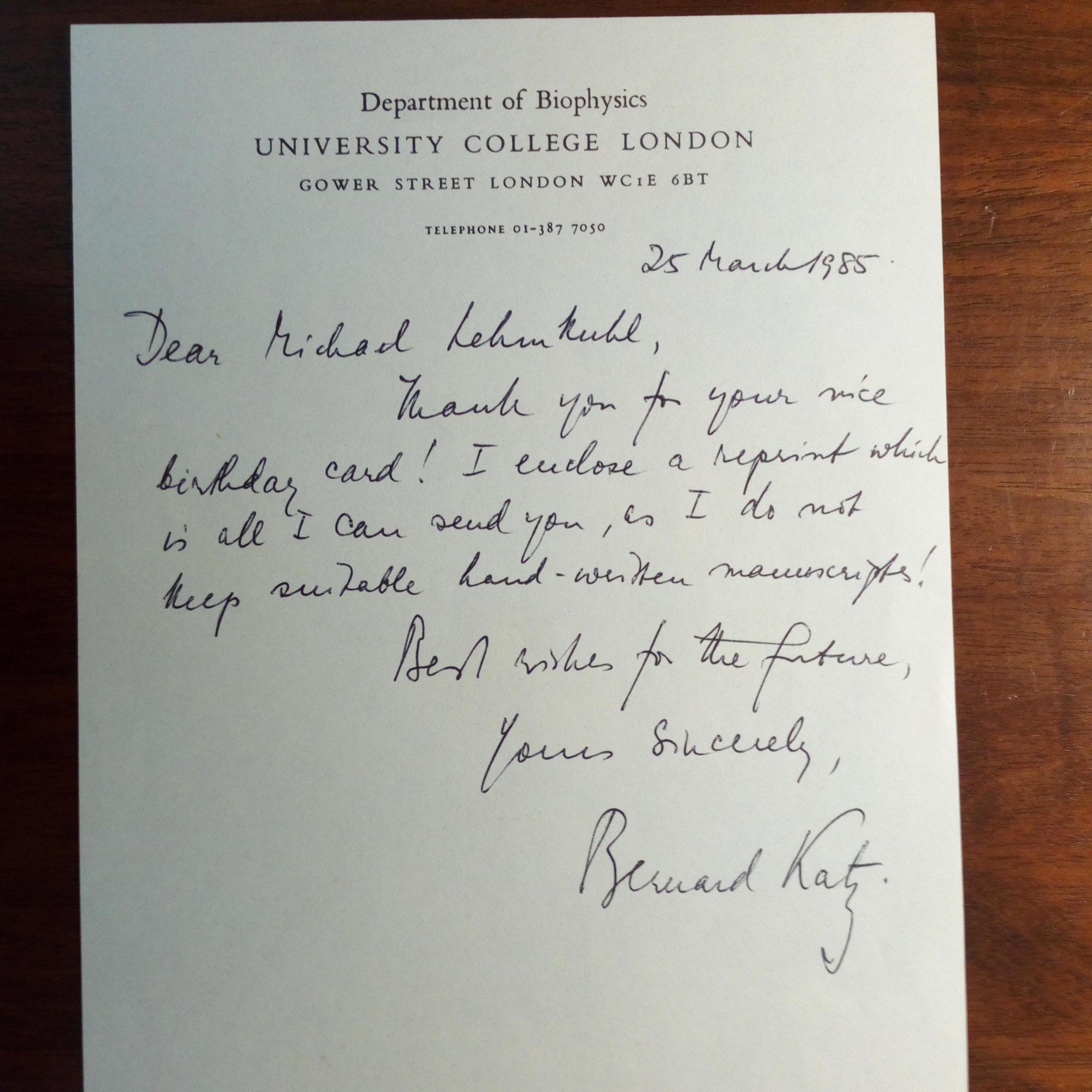 1911-2003, brit. Biophysiker - Karte mit Widm. und U. Mit e. Begleitbrief mit U., Briefkopf des "University College London" 3.10.1984. Beiliegen zwei ähnliche e. Begleitbriefe.