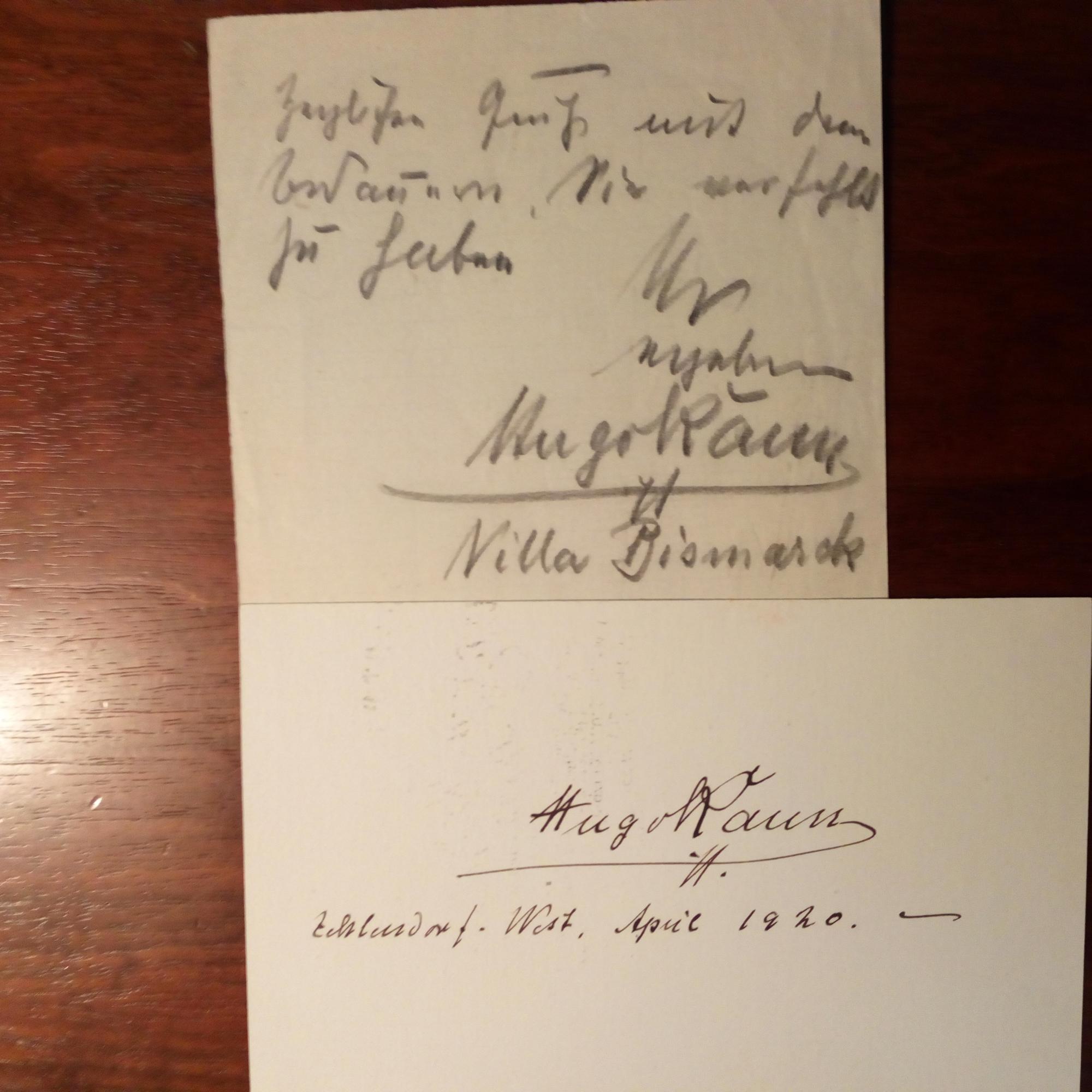 1863-1932, Pianist, Dirigent und Komponist - E. Billett mit U., "Villa Bismarck", Kopierstift. Bedauert "Sie verfehlt zu haben". Beiliegt Karte mit U., Zehlendorf April 1920, etw. fleckig.