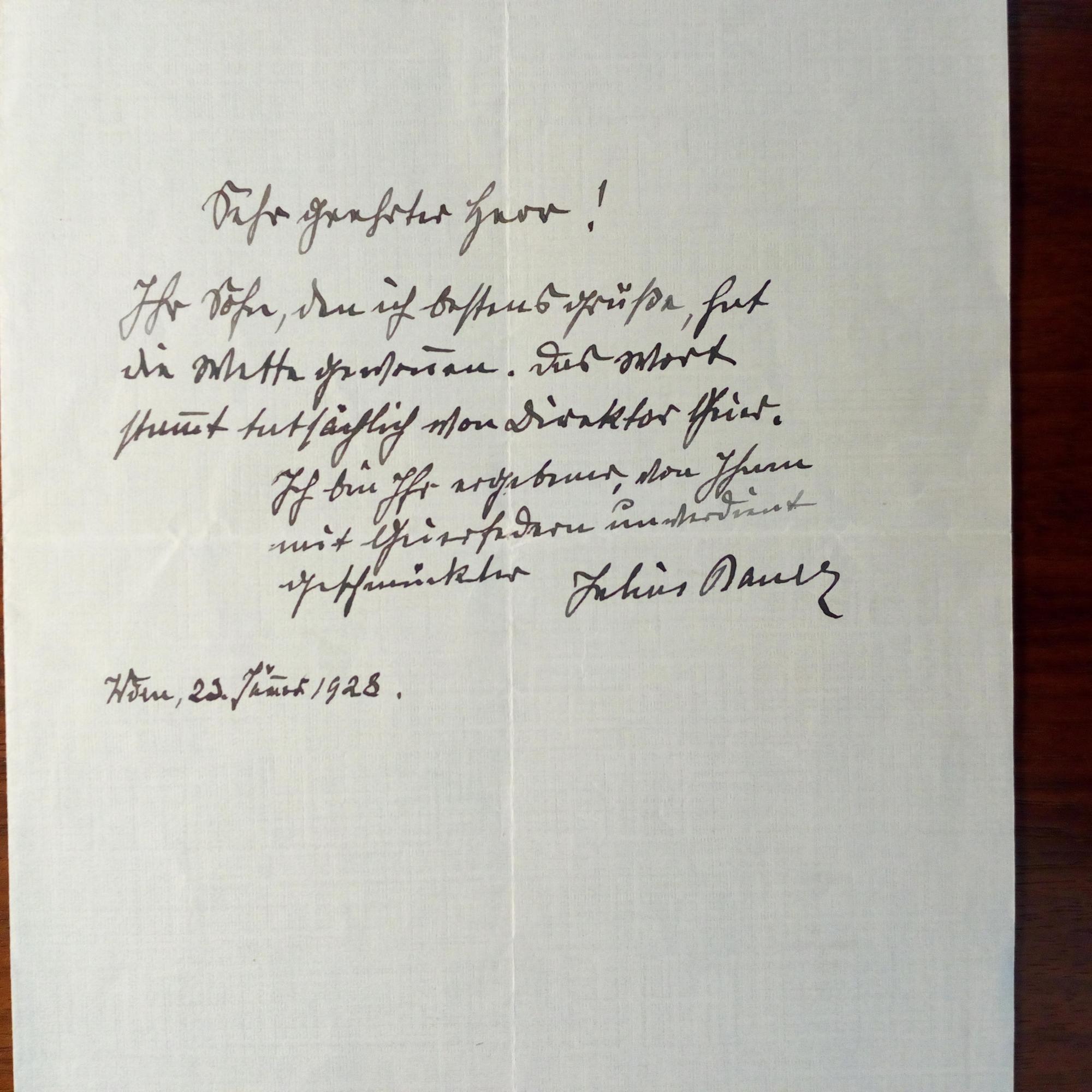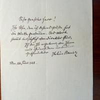 1853-1941, österr. Schriftsteller und Publizist - Schöne e. Mitt. mit U., Wien 23.1.1928, ½ S. 8°. ...Ihr Sohn...hat die Mette geschrieben. Das Wort stammt tatsächlich von Direktor Geier...