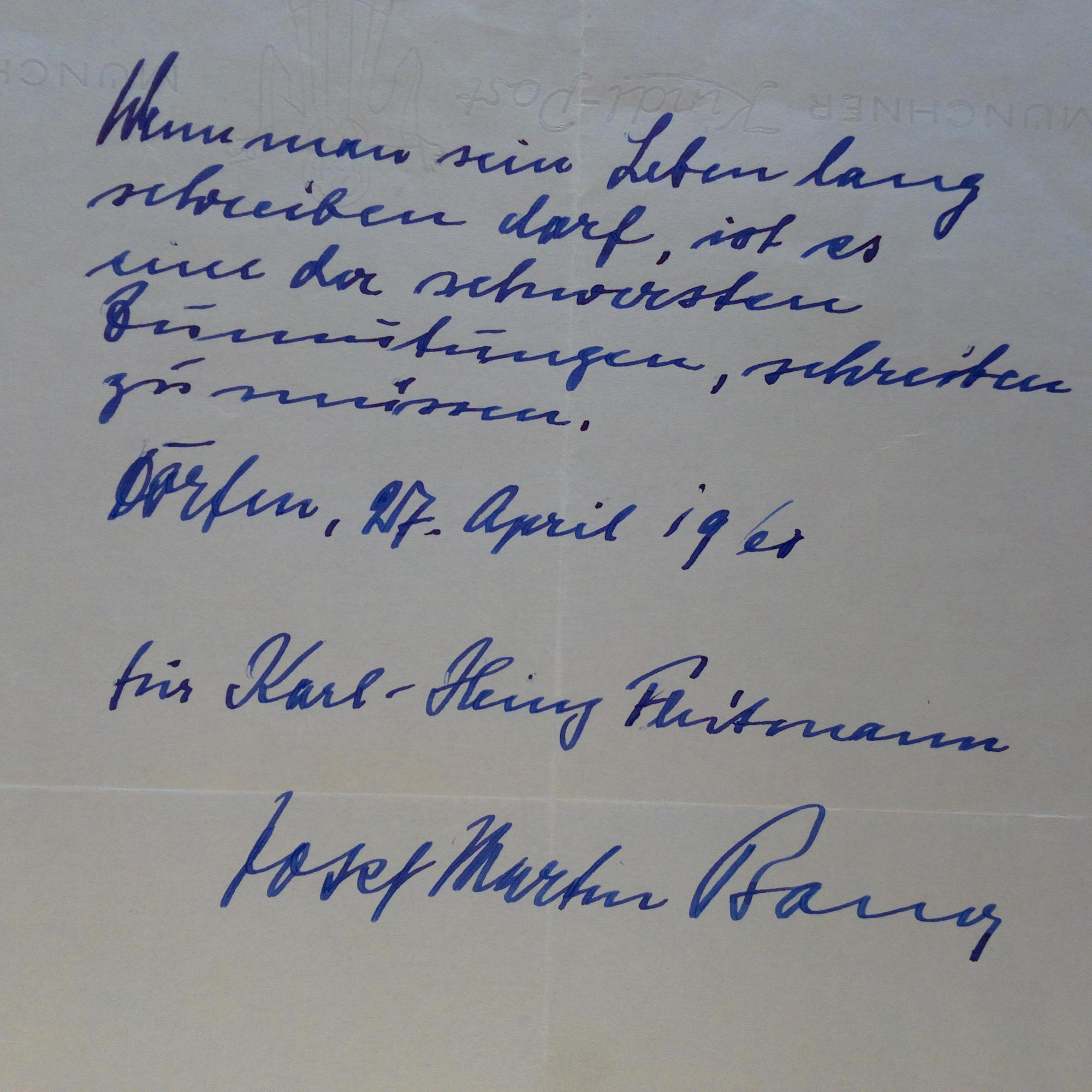 1901-70, Schriftsteller - Br. m. U., Dorfen (bei München) 26.9.1961, 1 S. 4°. An den Historiker und Jugend-Redakteur des Bayer. Rundfunks Herbert Ruland. Begleitbr. zum Script einer Sendung des Schulfunks zu "Alten Sprichwörtern": ...Man ersäuft im Material...