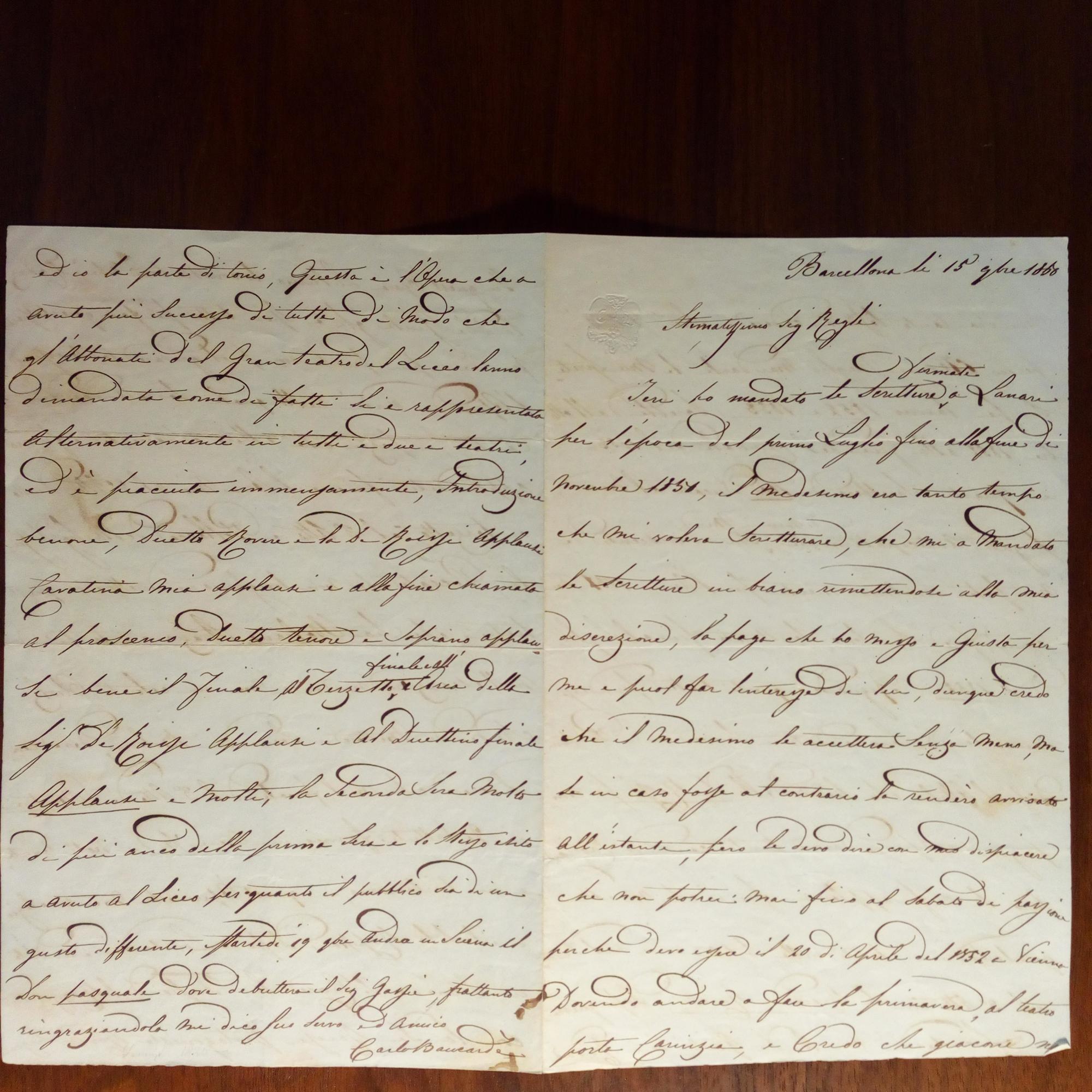1825-83, italien. Sänger (Tenor) - Schöner e. Brief mit U., Barcelona 15.11.1856, 4 S.8°. An den italien. Schriftsteller, Publi-zisten und Hrsg. eines biographischen Lexikons Francesco Regli (1802-66): Gibt ihm detaillierte Auskünfte über seine Engagements seit 1852.