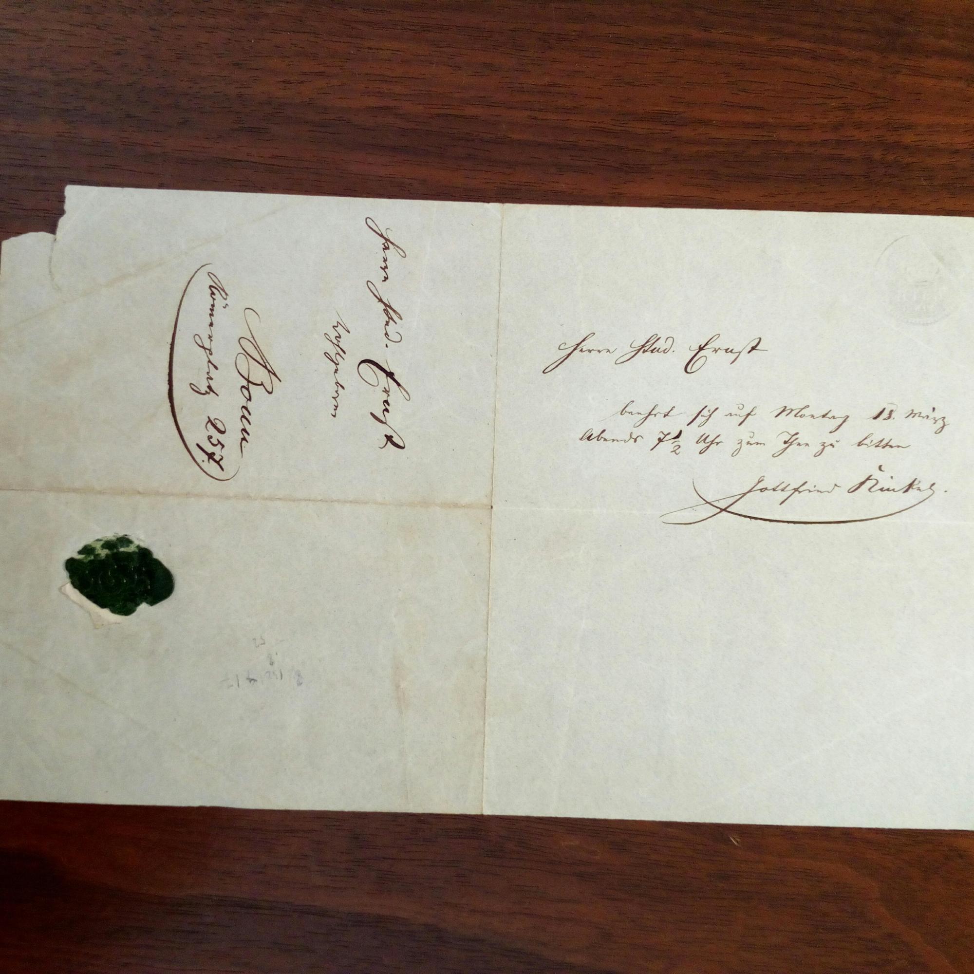 1815-82, Theologe, Schriftsteller, Politiker und Revolutionär - E. postal. Faltbrief mit U., (Bonn vor 1849), ½ S. kl. 8°, e. Anschrift, Siegelrest. Lädt "Stud. Ernst" "zum Thee" ein.