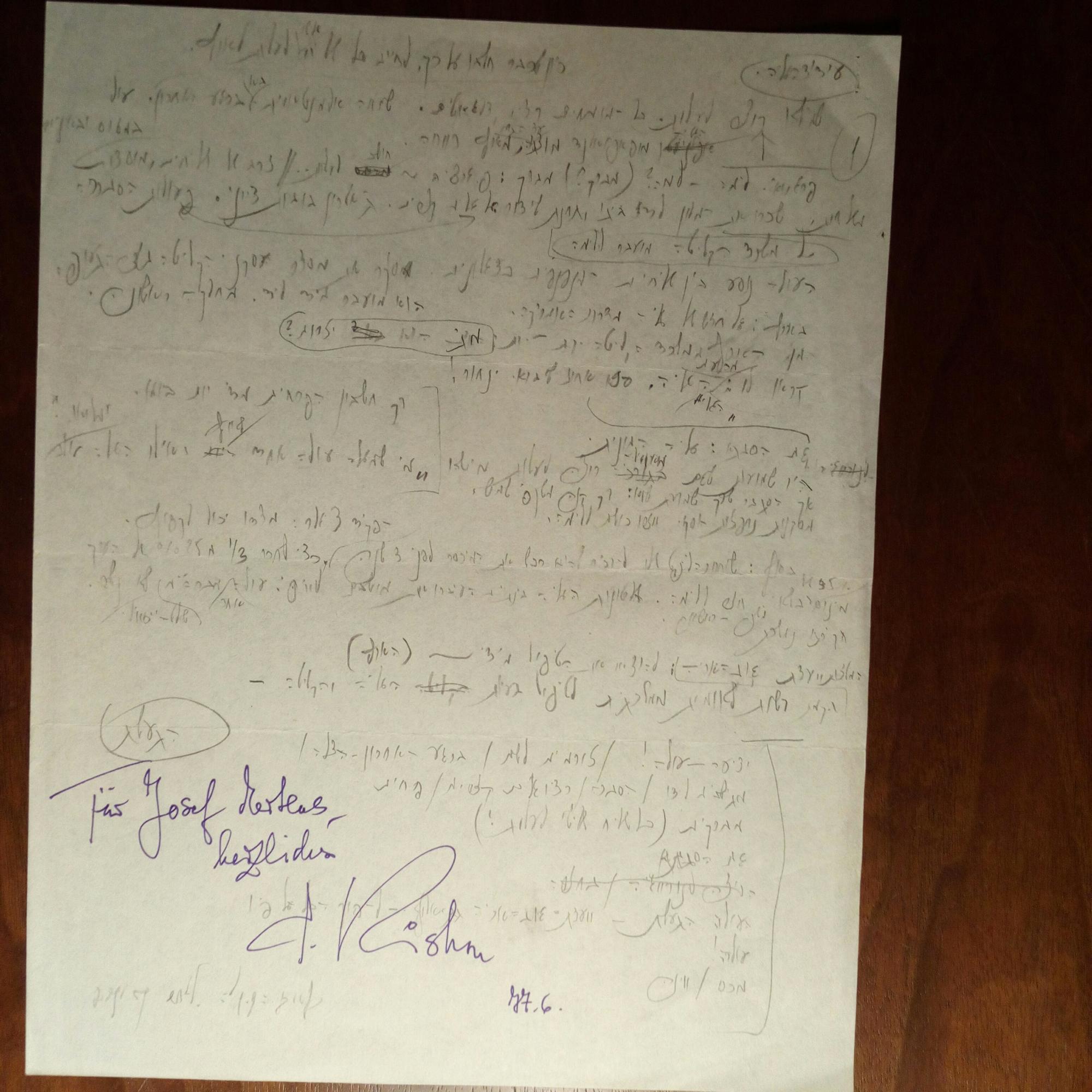 1924-2005, israel. Schriftsteller - S. aus e. Arbeitsmanuskript (4°, hebr. Schrift, Bleistift), nachträgl. Widm. und U., Juli 1977. Beiliegt Pfo. (Ausschnitt aus Buchprospekt), mit e. Gruß und U.