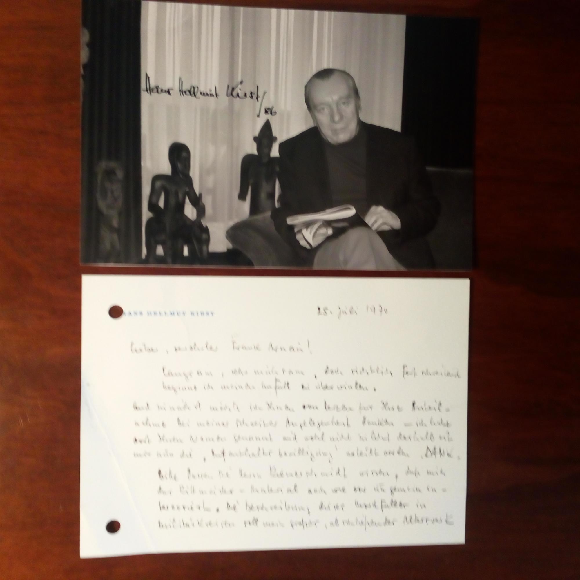 1914 - 1989, Schriftsteller - E. Briefkarte mit U., 25.7.1970, 2 S., sehr kl. Schrift, gel., Eckknick. An den Kollegen Frank Arnau (1894-1976): ...beginne ich meinen Unfall zu überwinden ... daß mich das Rittmeister-Material nach wie vor ungemein interessiert. Die Beschreibung dieses Mordfalles in Militärkreisen soll mein großes abschließendes Alterswerk werden. Die Kosten der Materialbeschaffung sollen dabei keine Kosten spielen ... habe jetzt schon 2 Monate beim Bundeskriminalamt in Wiesbaden gearbeitet... Beiliegen: Pfo. (vor afrikan. Figuren) mit U. und 3 SK, je mit U.