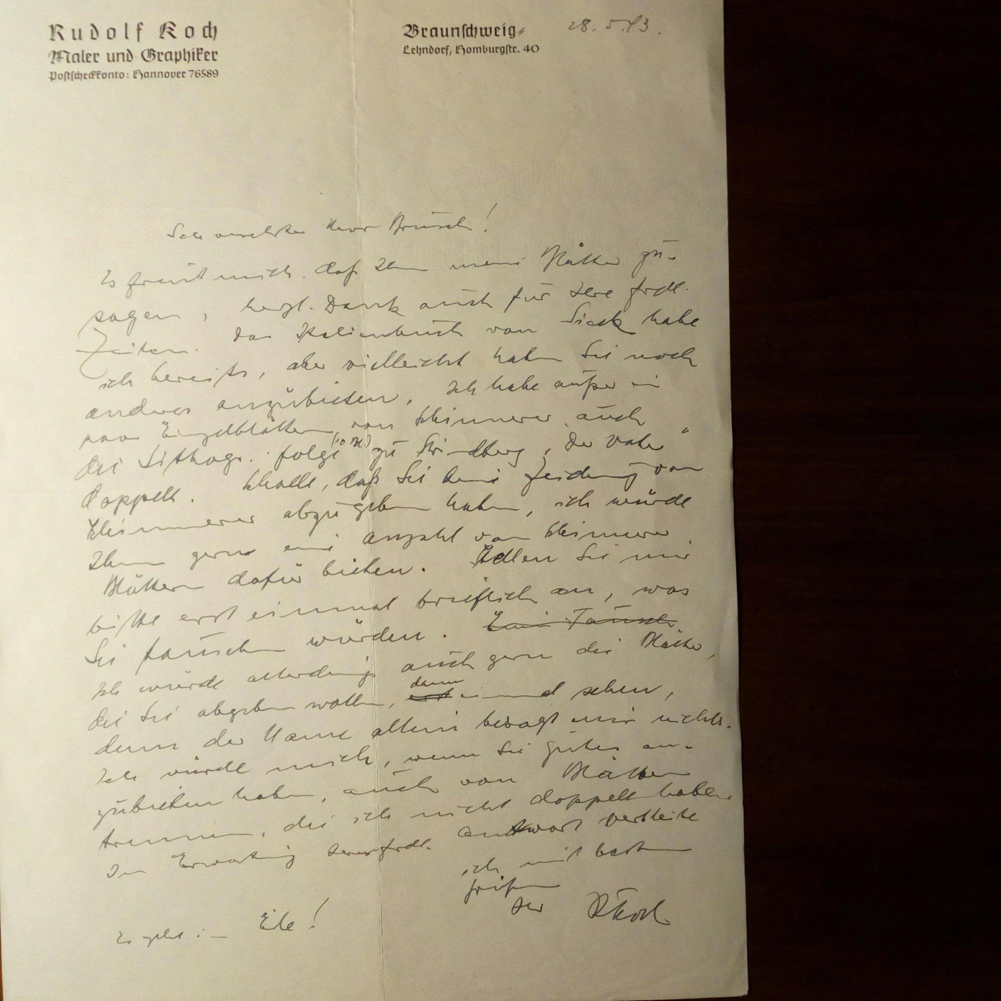 1902-85, Maler, Graphiker und Sammler - An den Lehrer, Maler und Sammler Adolf Brusch (1881-1958) in Lübbersdorf (Mecklenburg): E. Brief mit U., (Braunschweig) 28.5.1943, mit postal. Umschlag (Abs.-Stempel). betr. Austauschs von Bildern: ...habe außer ein paar Einzelblättern von Schinnerer auch die Lithogr.folge (10 Bl.) zu Strindbergs "Der Vater" doppelt... Beiliegen: E. postal. Feldpostkarte mit U., weitere U. im Abs. ...Meine Frau war letzten Sonntag hier, brachte Ihre Sendung mit...Die Totentanz-Mappe von B. habe ich schon... und e. Brief m. U., "im Westen" 4.3.1945, 1 S. 4° mit Schilderung vom Kriegsalltag. ...ob ich meine Sammlung je wiedersehe...