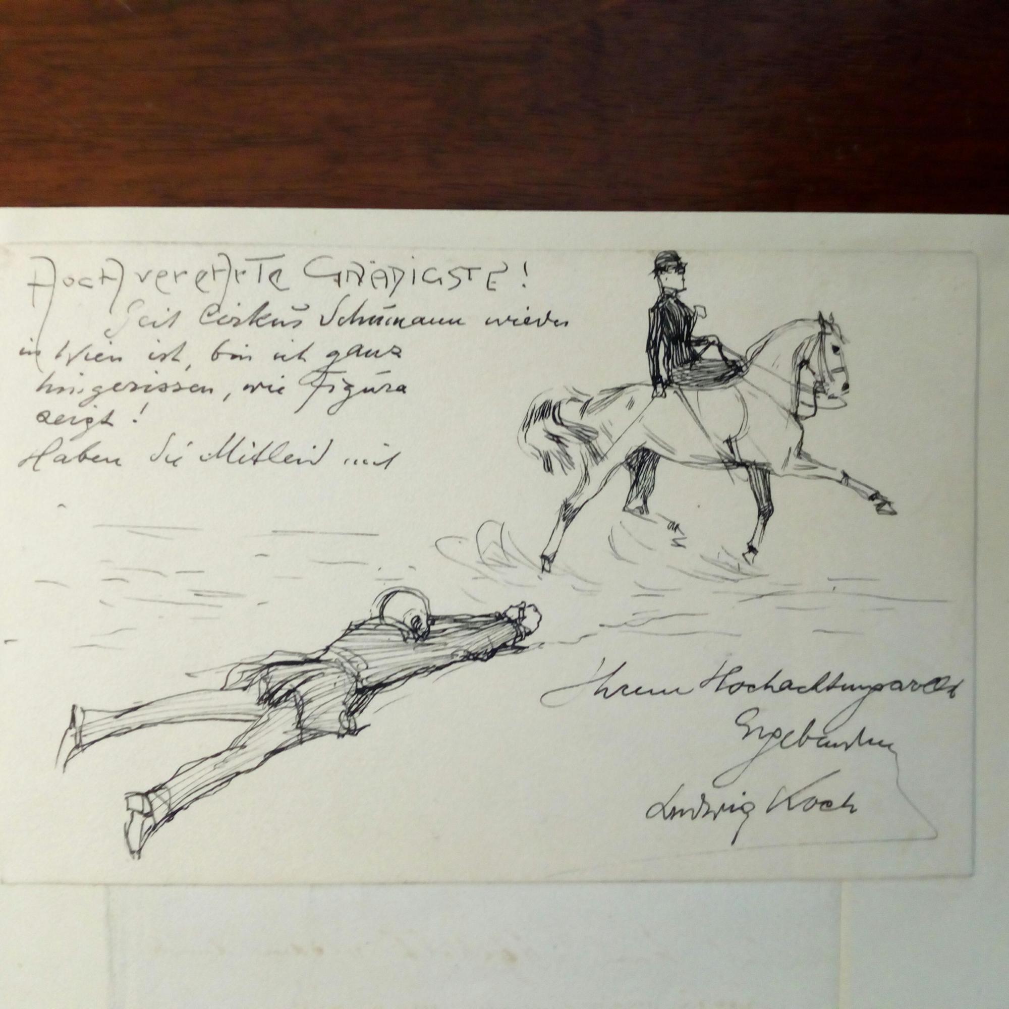 1866-1934, österr. Pferdemaler - Karte mit e. witziger Zeichnung, e. Anmerkung und U. "Hochverehrte Gnädigste! Seit Circus Schumann wieder in Wien ist, bin ich ganz hingerissen, wie Figura zeigt! Haben Sie Mitleid mit...", mont. auf 8°quer. Auf Rückseite e. Brief mit U. des schwed. Malers Bengt Nordenberg (1822-1902), Düsseldorf 12.1.1882.