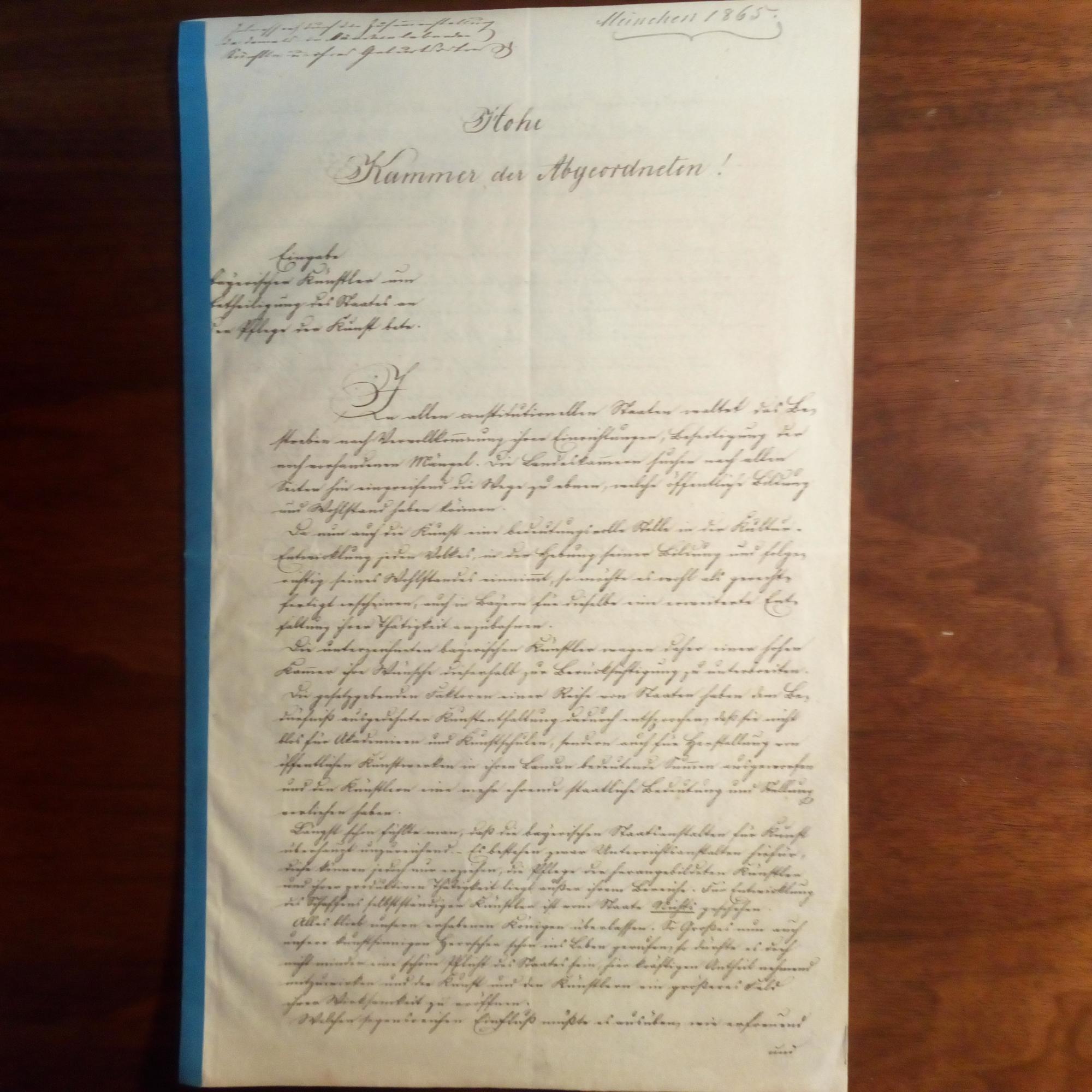 1829-99, Bildhauer - E. Anmerkung m. U., München 25.3.1865, Bleistift, auf Rückseite einer Kopie (Stich), 6 ½ S. folio, später gebunden. An die Redaktion der "Augsburger Allgemeinen Zeitung": Eingabe an die bayer. Abgeordnetenkammer "Bayer. Künstler um Betheiligung des Staates an der Pflege der Kunst betr.".