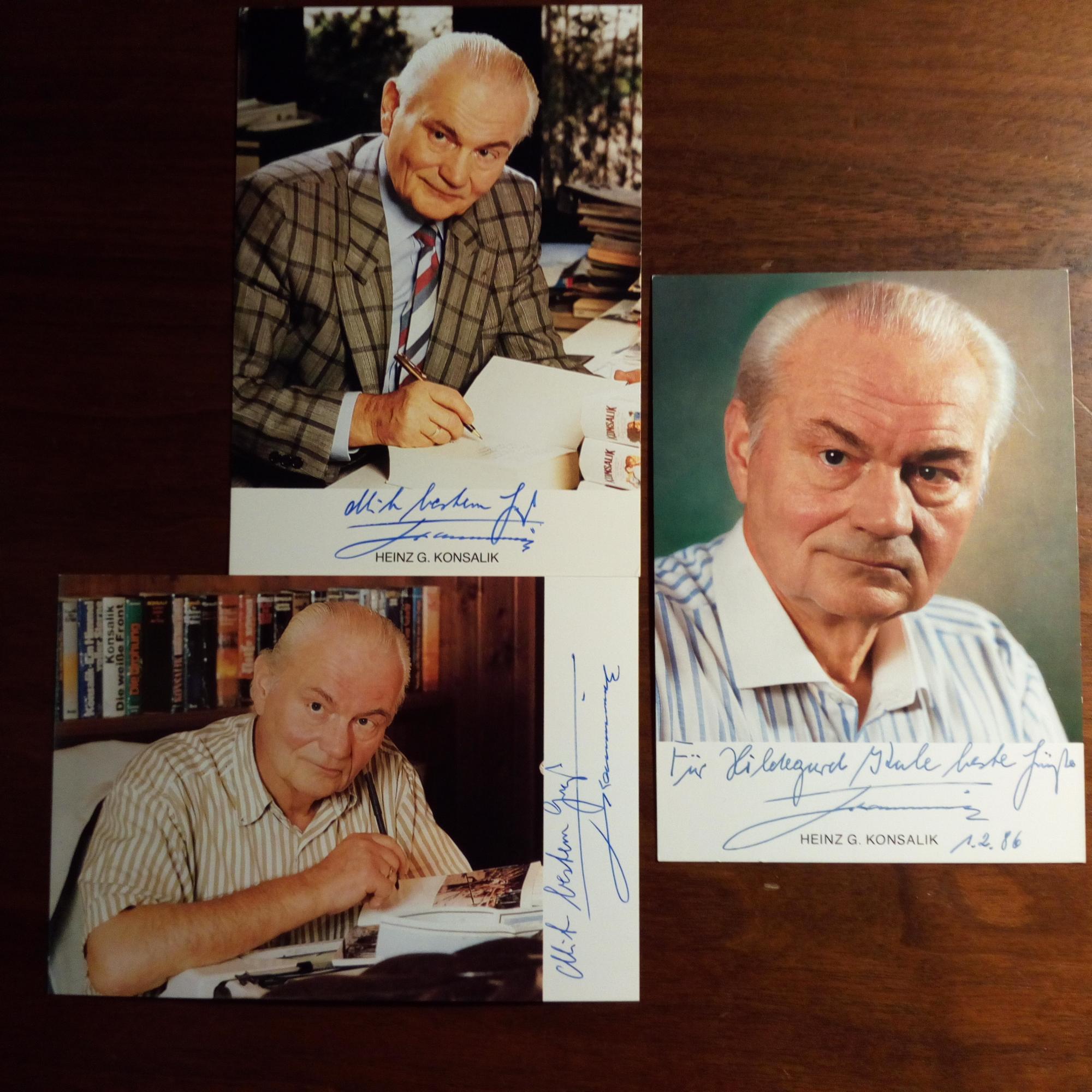 1921-99, Schriftsteller - 3 Farb-Pfo., je mit e. Gruß und U., eines mit Widm. 1.2.1986.