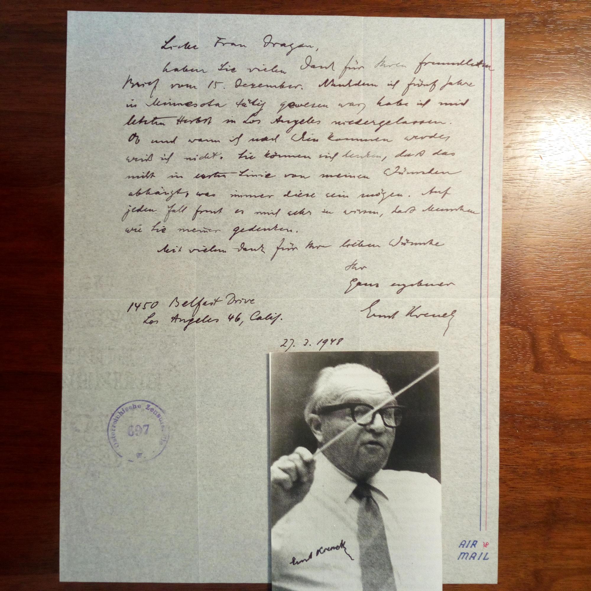 1900-91, US-Komponist österr. Herkunft - E. Br. m. U., Los Angeles 27.3.1948, ¾ S. 4°, m. e. postal. Umschlag (U. im Abs., Marke ausgeschn.), beides m. Zensurstempel. An die Vizepräsidentin der Singakademie in Wien: ...Nachdem ich fünf Jahre in Minnesota tätig gewesen war ... ob und wann ich nach Wien kommen werde, weiß ich nicht... Beiliegt Pfo (Hochgl., Repro aus Zeitung) mit U.