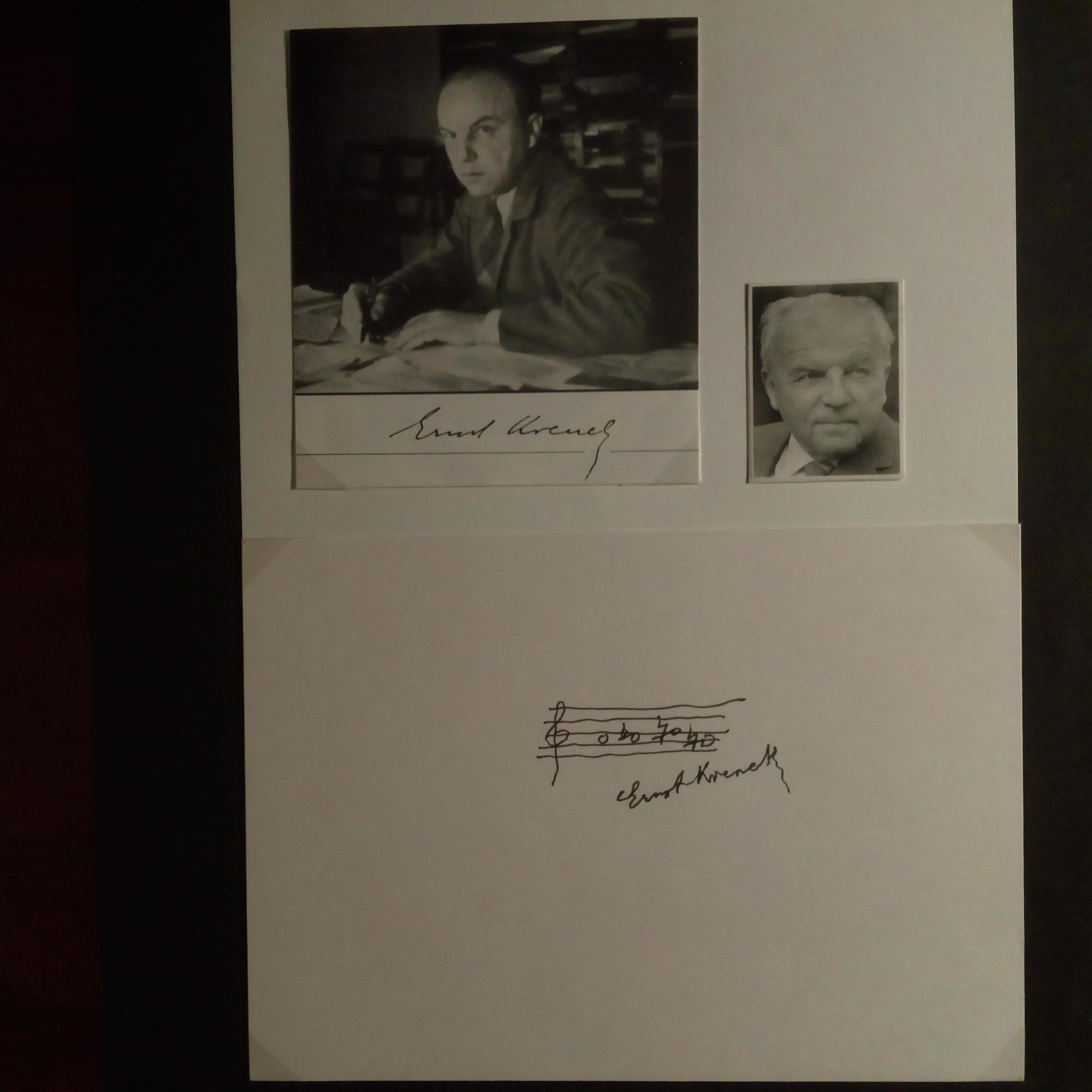 1900-91, österr. Komponist - Notenblatt (1 S., schmal-4°), Transparentpapier, gefaltet, 6 Takte: ..."Ausgerechnet und verspielt", op. 179, 1961 ... "Das Rad der Welt dreht rätselhafter Zufall"...) mit U. Beiliegen: Karte mit mont. Zeitungs-Pfo und U. und Blatt mit früher Bleistift-U.