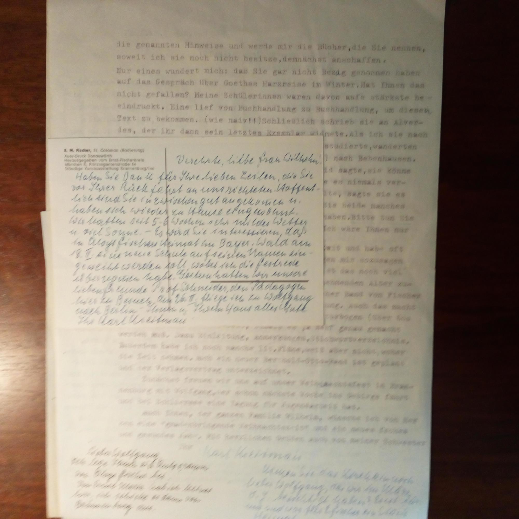 1898-1982, Pädagoge, Schriftleiter der Zeitschrift "Dt. Volksgeist" - 3 Briefe mit e. Zusätzen und U., Deggendorf und München 1962-65, 2 S. 8°quer und 4 S. 4°, und e. Ansichtskarte (Radierung von Ernst Fischer) mit U., alles dicht geschr. An frau Wilhelm: Ausführl. über sein Privatleben, seine Arbeit und zu dem Pädagogen Aloys Fischer. Erwähnt einen Besuch des kathol. Pädagogen Friedrich Schneider.