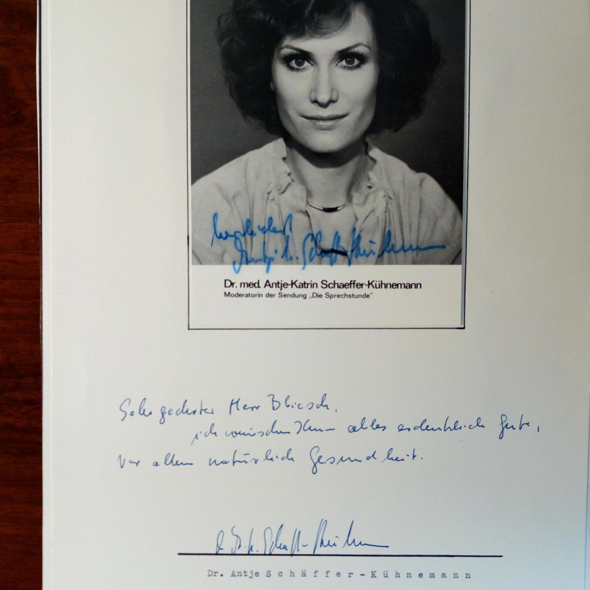 1945-2025, Ärztin, Publizistin und TV-Moderatorin - E. Zeilen und U. ("Schäffer-K.ühnemann") unter auf 4° mont. Pfo. (um 1975, zur TV-Sendung "Die Sprechstunde") mit E. und U. Beiliegt Farb-Pfo. mit E., U. und Jahr 1992 (ger. Wischspur).