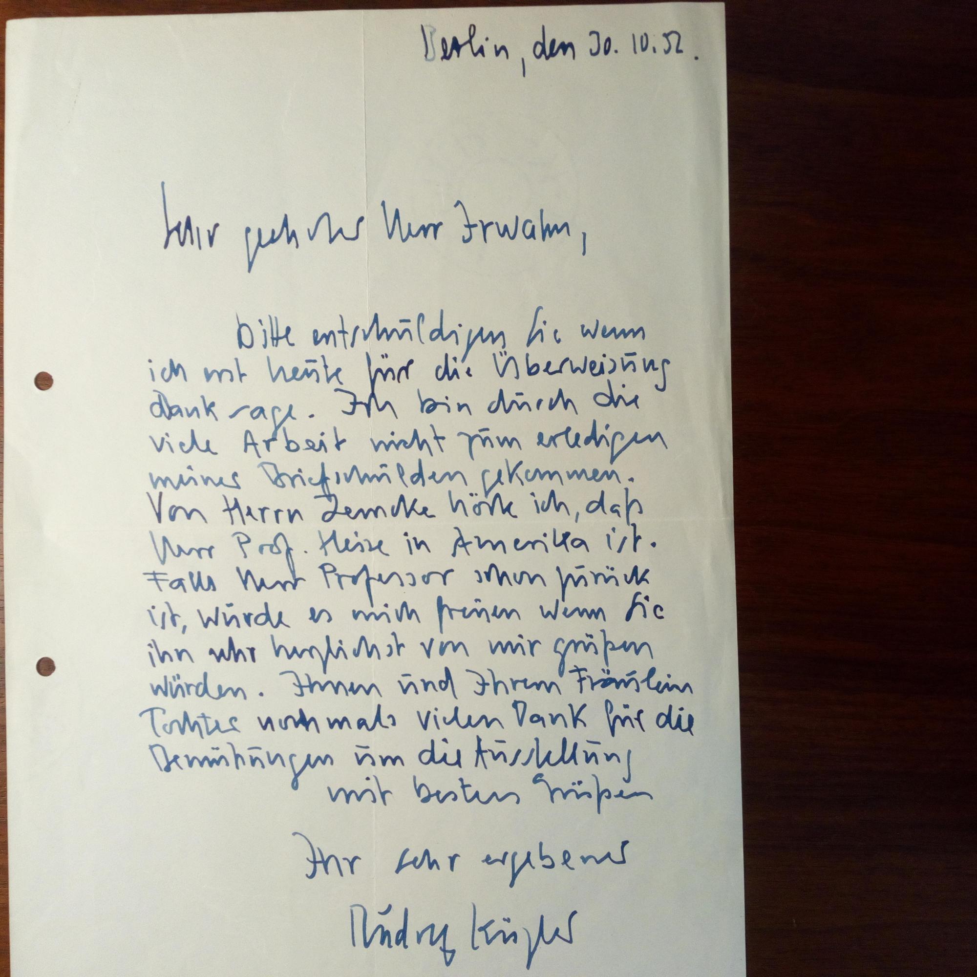 1921-2013, Maler und Graphiker - E. Brief mit U., Berlin 30.10.1952, 1 S. 4°, gel. An den Hamburger Bildhauer Martin Irwahn (1898-1981): Dankt für eine Ausstellung und eine Überweisung. Lässt Prof. Heise, der gerade "in Amerika ist", grüßen.