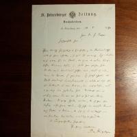 1843-1904, Kritiker und Publizist - E. Br. m. U., (St. Petersburg) 10.5.1890, 1 S. 8°, kl. Schrift, geringe Gebr.spuren, Br.kopf als Redakteur der "St. Petersburger Zeitung". An den Schriftsteller Johannes Trojan (1837-1915) in Berlin: Er bewundere dessen Zeitschrift "Kladderadatsch" sehr. ...wenn Sie mir von Zeit zu Zeit eine kleine Reclame-Anzeige schicken würden, die ich gern ohne Kosten aufnehmen werde...