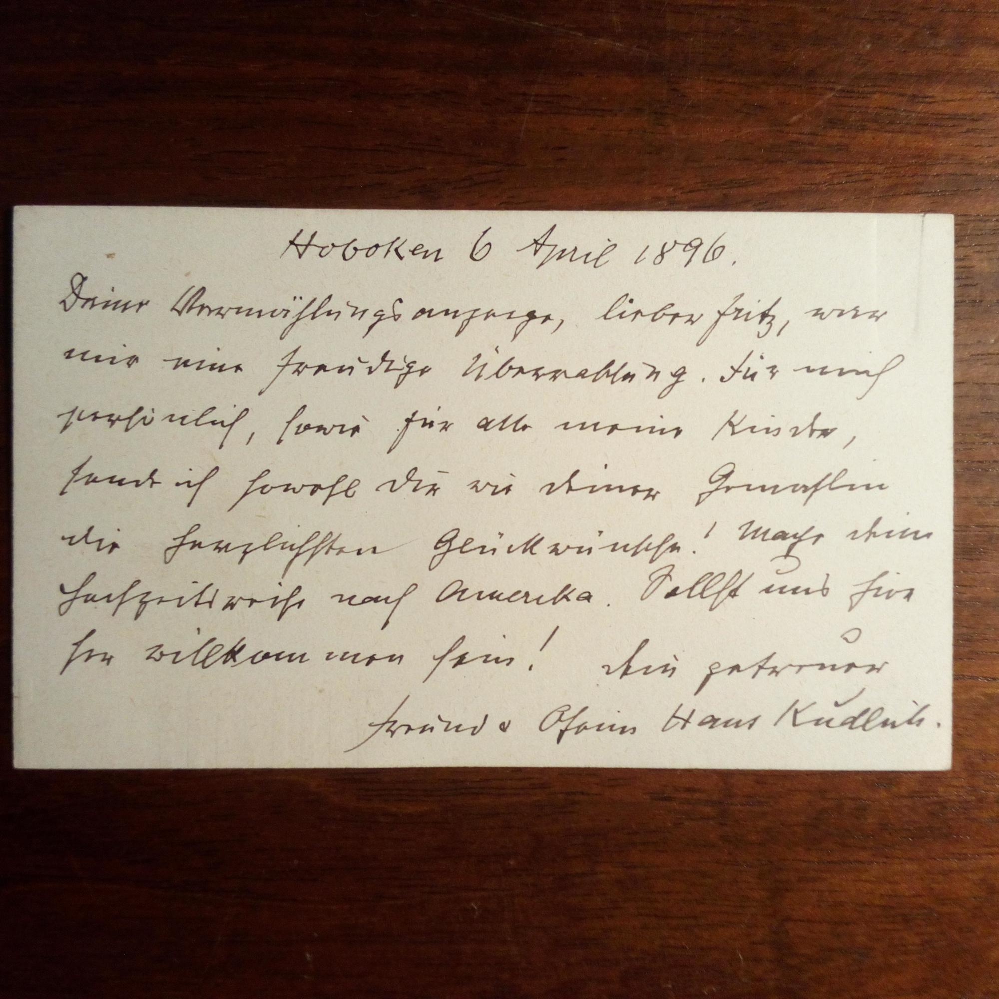 1873-1917, österr. Politiker, musste nach Teilnahme am Oktoberaufstand in die USA fliehen - E. Br. m. U. auf Rückseite seiner Visitenkarte, kl. Schrift, Hoboken (USA) 6.4.1896. Dankt seinem guten Freund Fritz für dessen "Vermählungsanzeige" und fragt, ob er seine Hochzeitsreise nicht nach Amerika machen wolle.