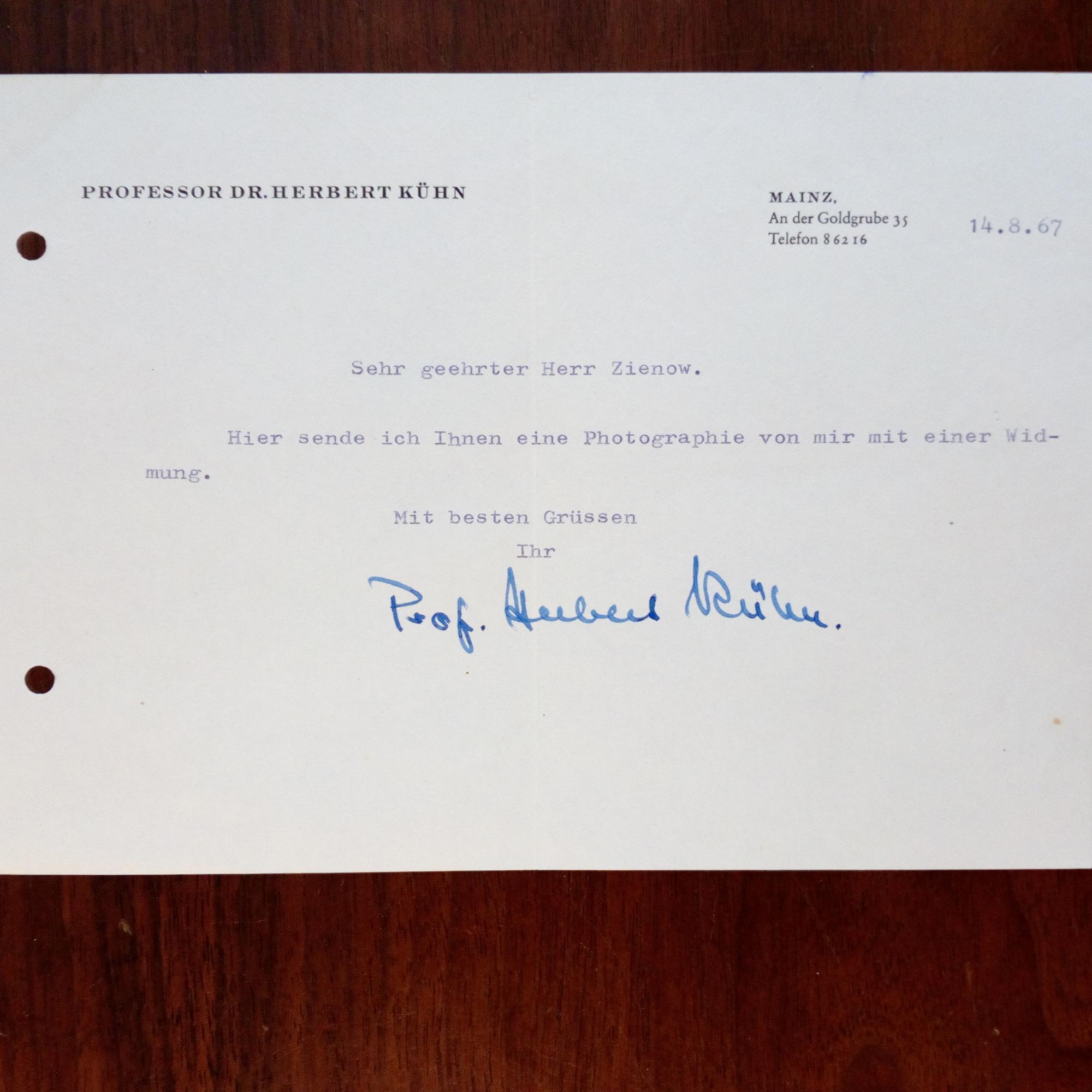 1895-1980, Prähistoriker - Kl. Br. mit U., (Mainz) 14.8.1967, 1 S. 8° quer. Begleitbr. zu Foto (liegt nicht mehr bei.).