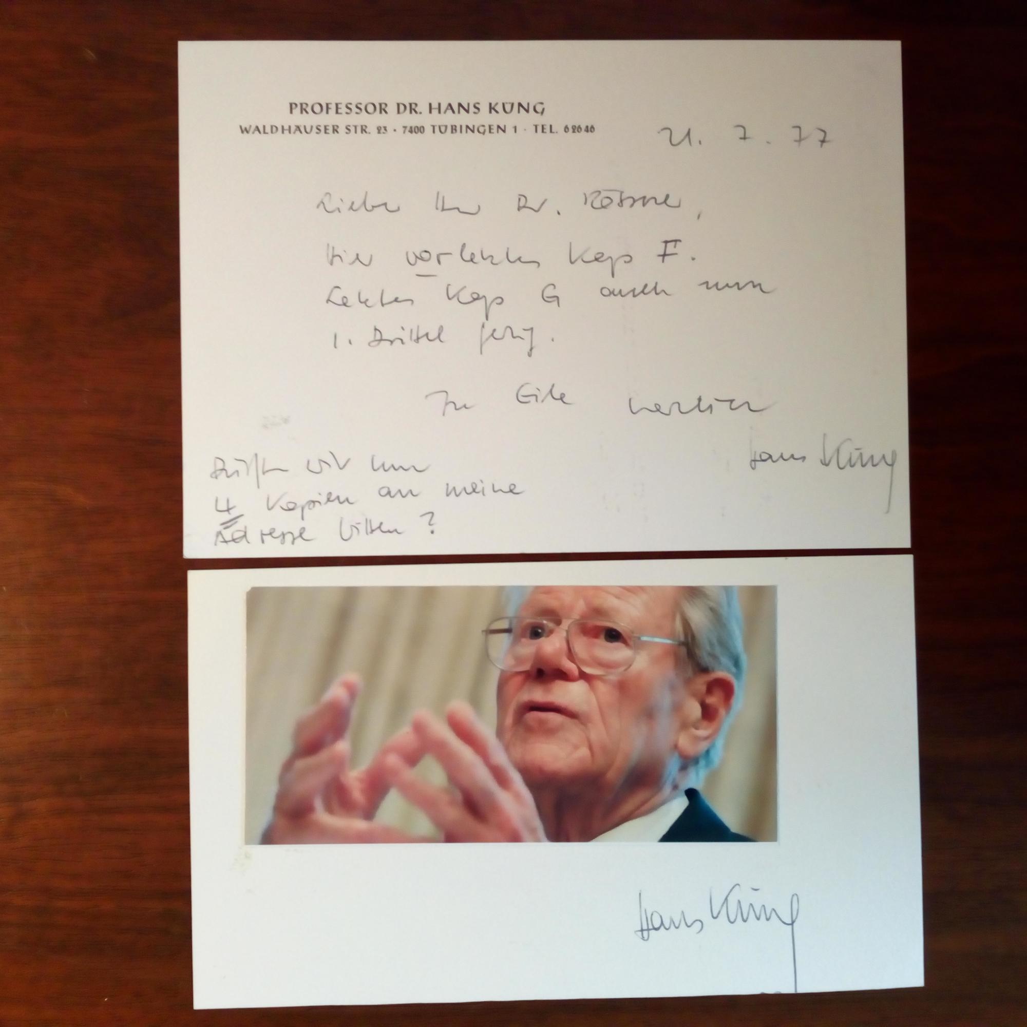 1928-2021, Theologe und Kirchenkritiker - E. Briefkarte mit U., (Tübingen) 21.7.1977, 1 S., Briefkopf Teilt seinem Lektor beim Piper-Verlag in München Rössner die Fertigstellung eines Kapitels mit. Beiliegen: Briefschluss (Fragment) mit U. Bittet um "einen Scheck wie das letzte Mal" nach Sursee (Schweiz)/ Werbeblatt des Verl. (1977) mit E. und U.,/ und Karte mit mont. Farb-Pfo. und U.