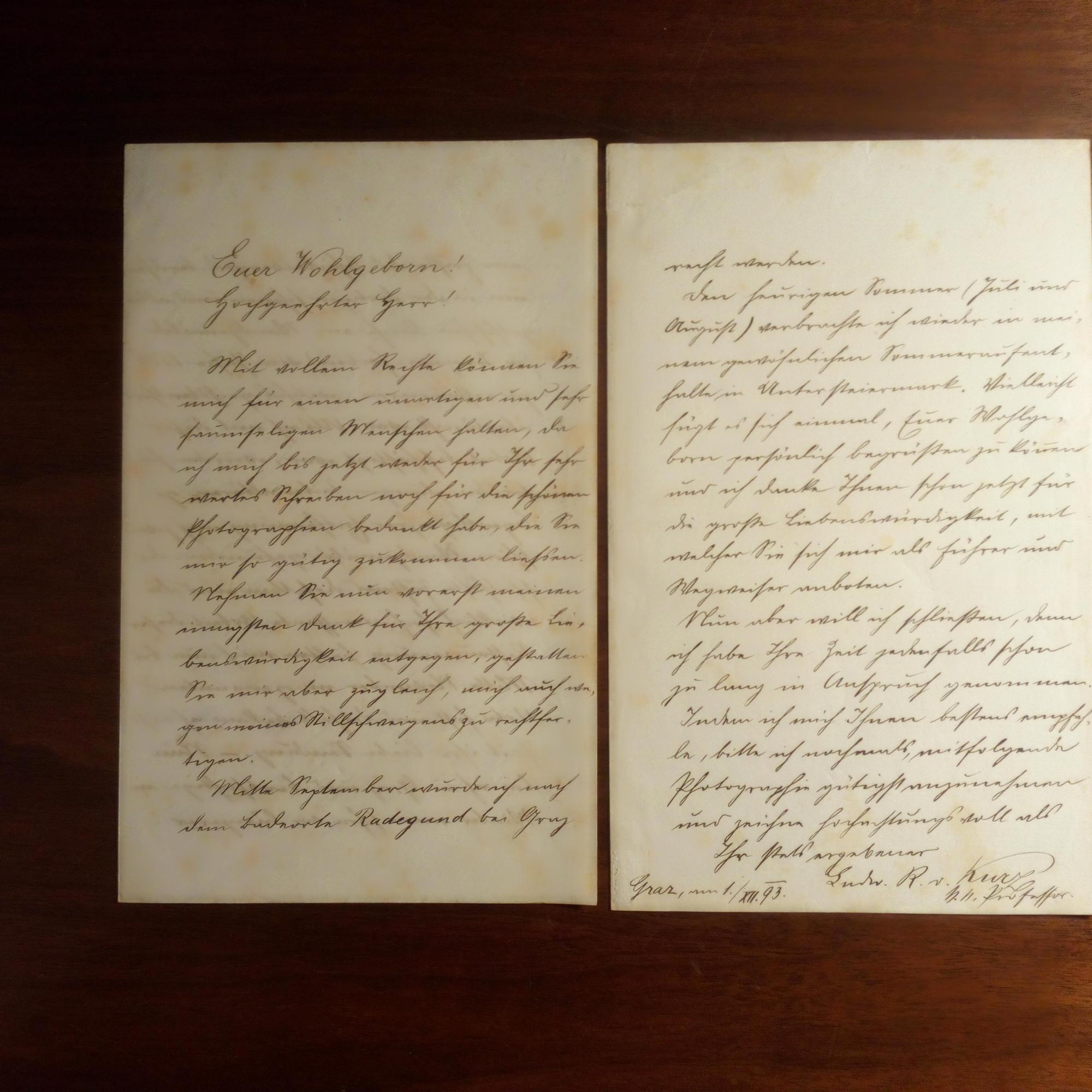 1850-1939, schweiz. Maler, Prof. in Graz - Schöner e. Br. m. U., Graz 1.12.1893, 5 S. gr.8°, kl. Gebr.spuren. Über Reisen, Arbeiten u. schickt Skizzen.