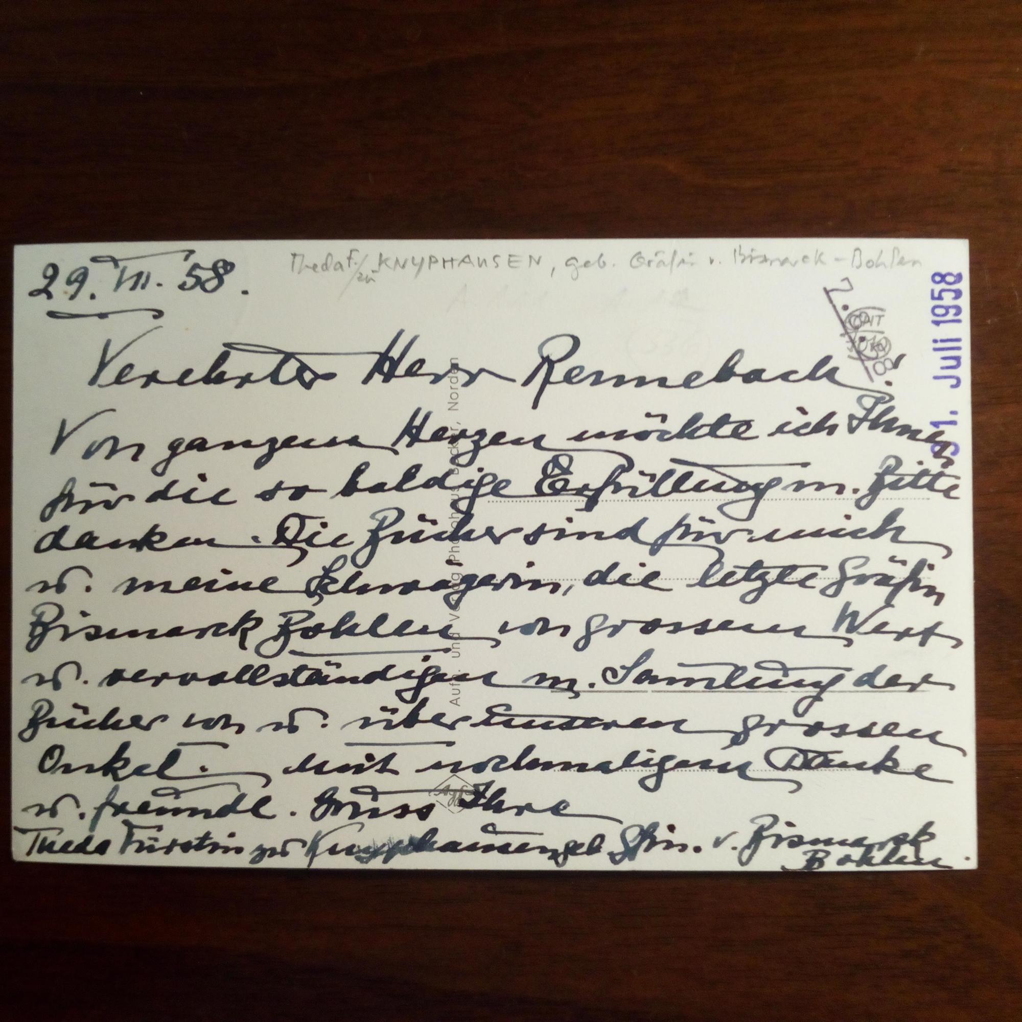 geb. Gräfin von Bismarck-Bohlen, 1885-1969 - E. postal. Ansichtskarte (Burg Berum, Ostfriesland) mit U. und D. 29.7.1958, D.-Stempel, kl. Wasserspur. Dankt Rennebach für Bücher: ...für mich u. meine Schwägerin, die letzte Gräfin Bismarck-Bohlen von großem Wert...