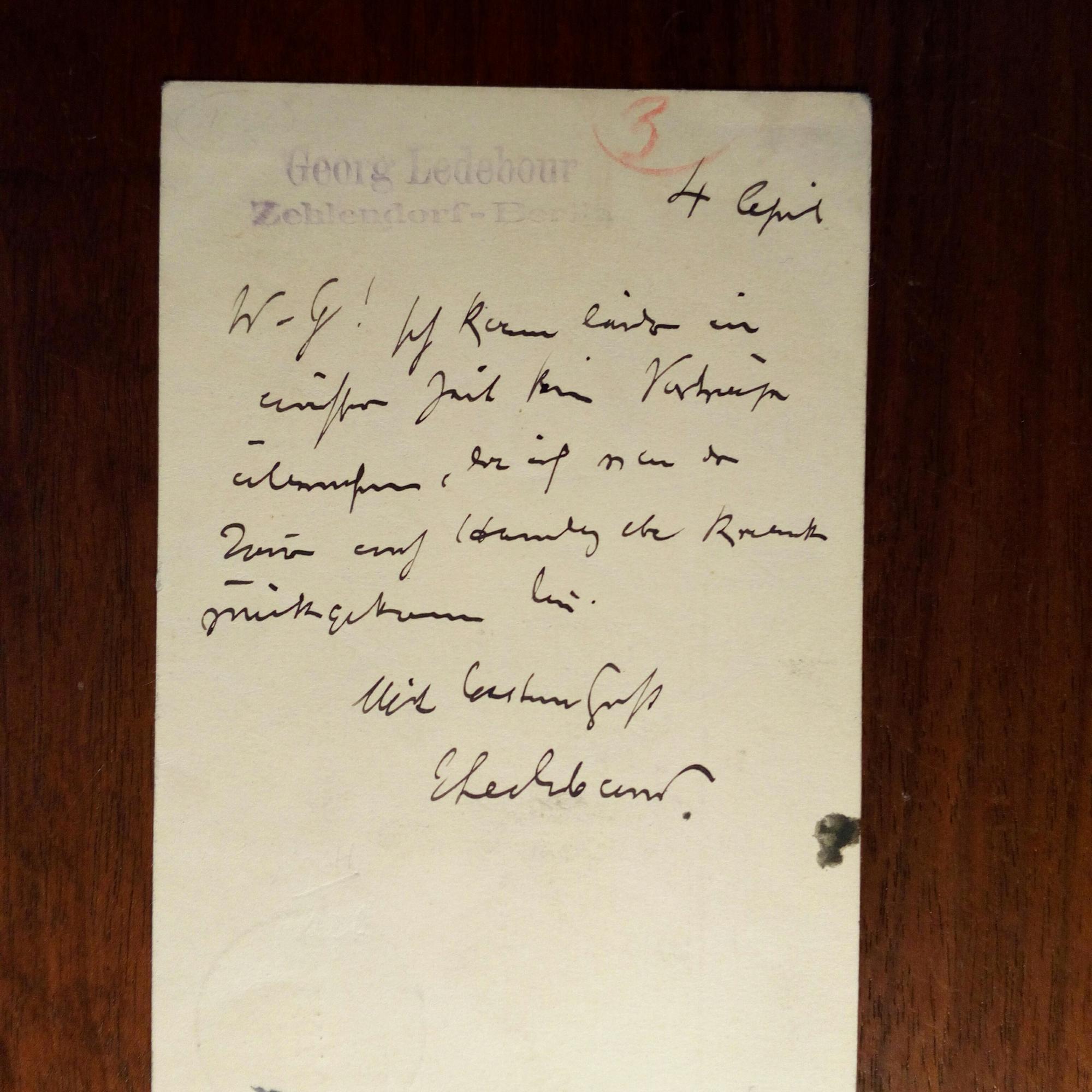 1850-1947, Journalist und sozialist. Politiker - E. postal. Postkarte mit U., (Berlin 4.4.1910), Abs.stempel, Gebr.spuren. An den Journalisten, Volkspädagogen und Senator in Lübeck, William Bromme (1873-1926): ...kann leider in nächster Zeit keine Vorträge übernehmen, da ich von der Reise nach Hamburg sehr krank zurückgekommen bin...