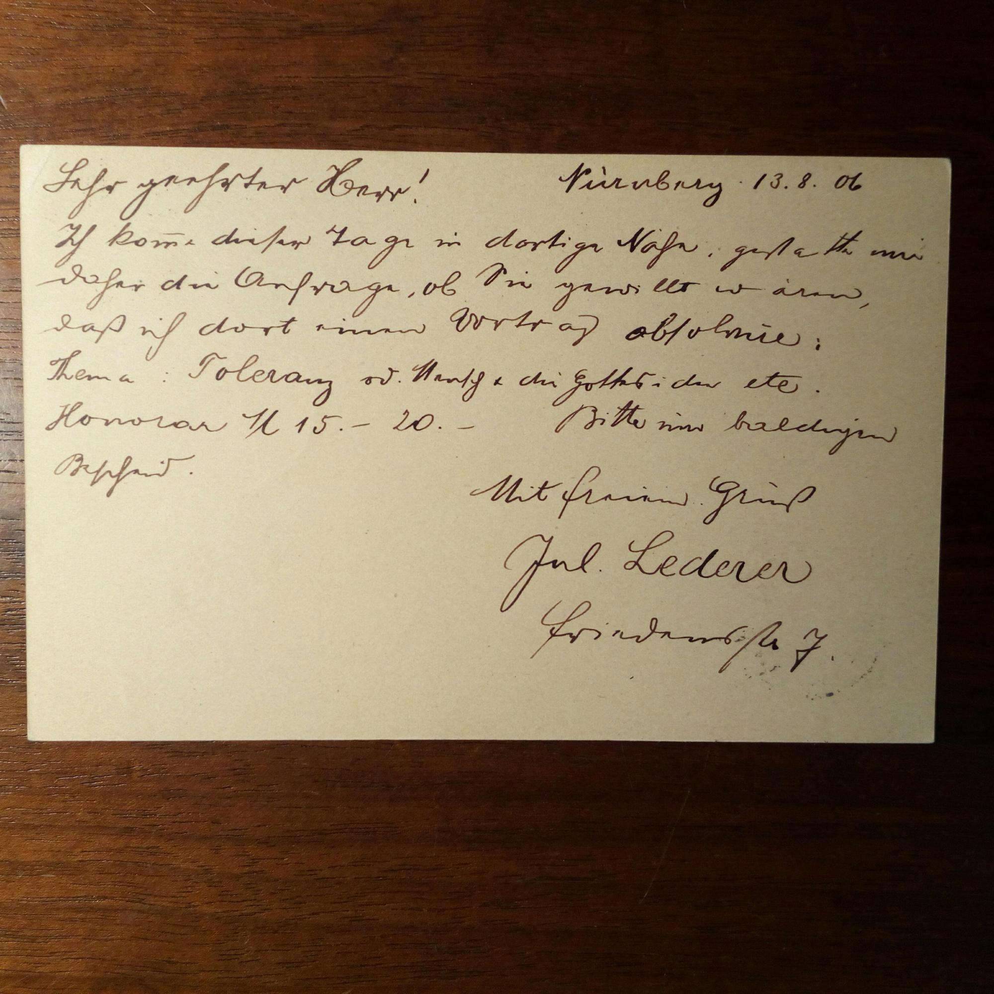 1867-1939, SPD-Parteifunktionär und Publizist - E. postal. Postkarte mit U., Nürnberg 13.8.1906. An Architekt Emil Rösler (1874-1954) in Plauen. Bietet Vorträge an: ...Thema Toleranz od. Mensch + die Gottesidee etc. Honorar M 15.-20.-...
