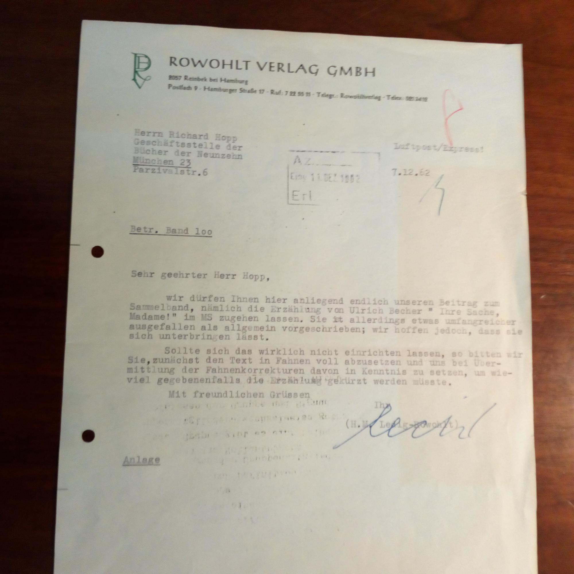1908-92, Verleger - Brief mit U., (Reinbek) 7.12.1962, ¾ S. 4°, Br.kopf des Verl., gel., Aktenzeichen, ger. Altersspuren. An die "Geschäftsstelle der Bücher der Neunzehn" betr. der Erzäh-lung "Ihre Sache Madame" von Ulrich Becher für einen Sammelband.