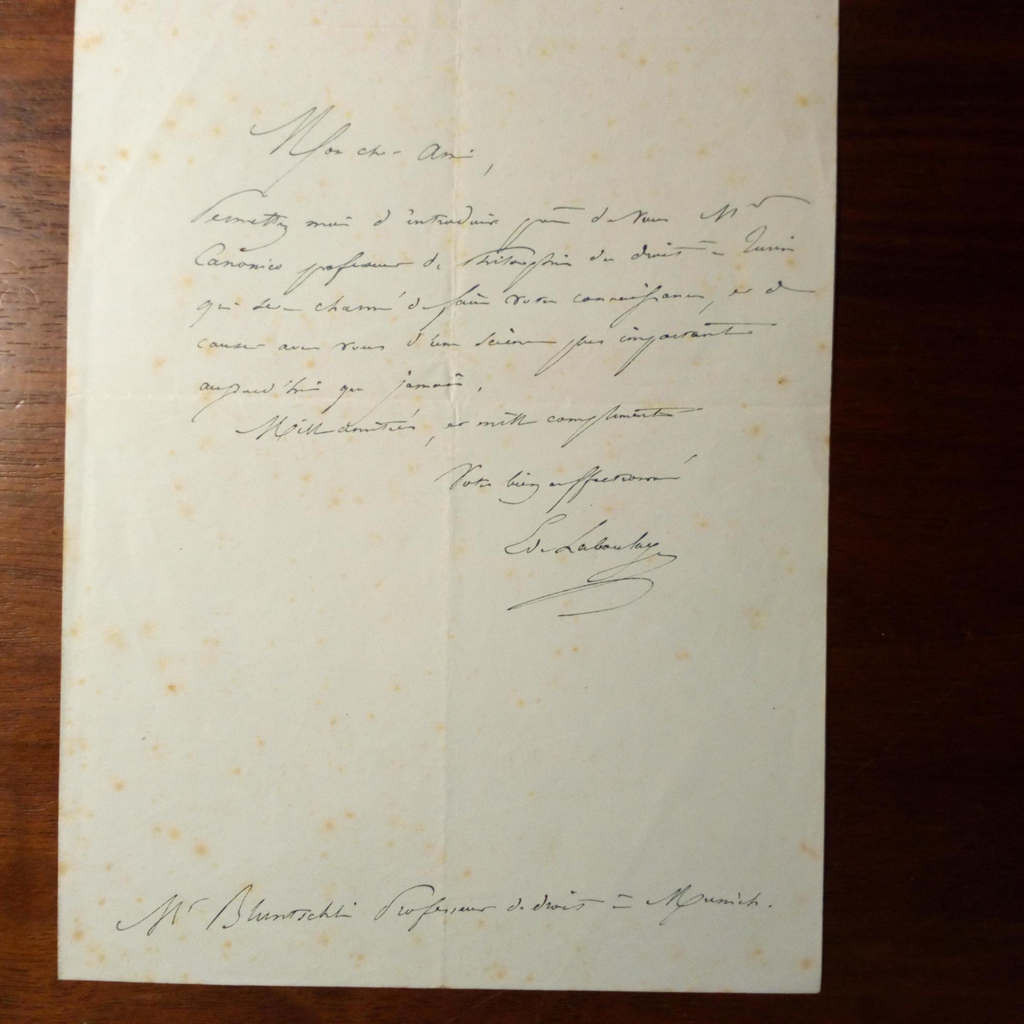 1811-83, frz. Jurist, Journalist und Politiker, regte die Schenkung der Freiheitsstatue an die USA an - E. Brief mit U., ¾ S. 8°, kl. Gebr.spuren. Frz. an den schweizer Juristen Johann Caspar Bluntschli (1808-81) in München: Empfehlung für den Rechtsphilosophen "Canonico".
