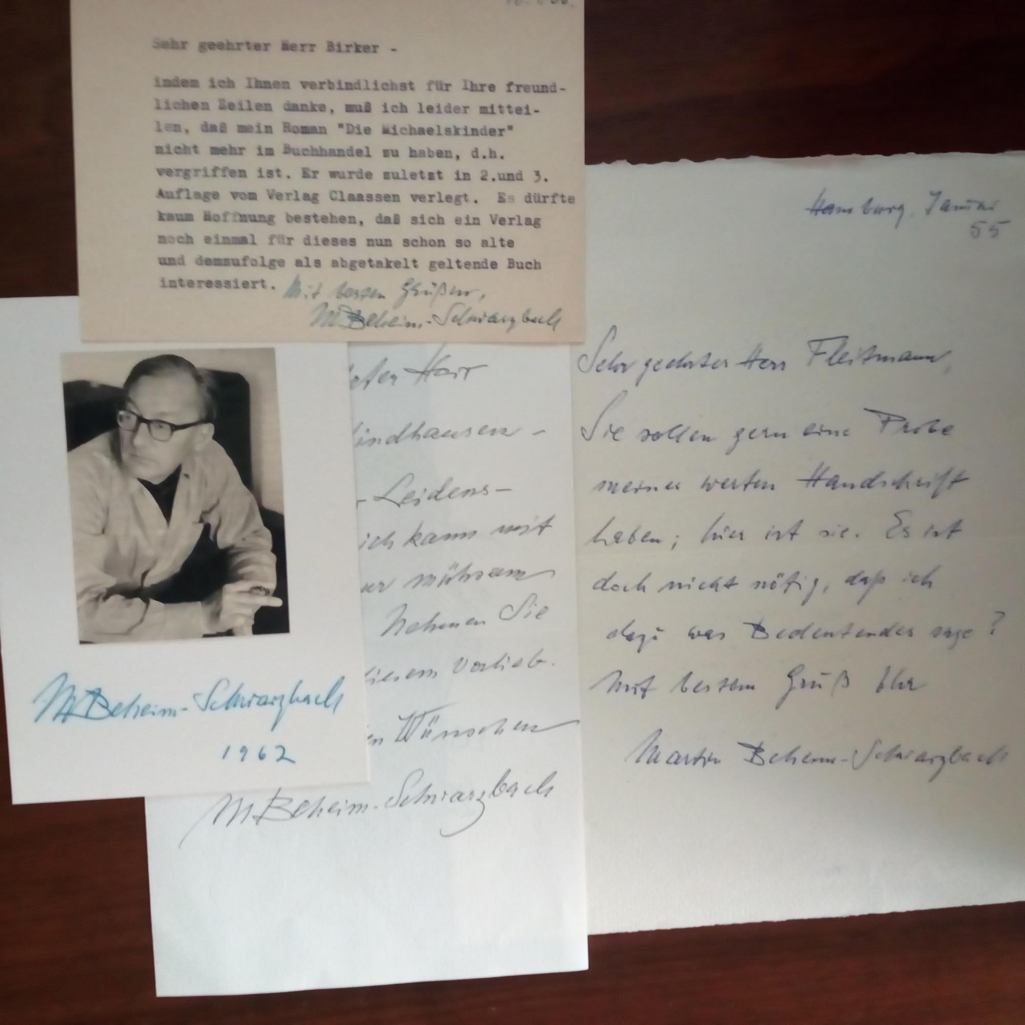 1900-85, Schriftsteller - E. Brief mit U., Hamburg Jan.1955, 1 S. kl. 4°. ...Sie sollen gerne eine Probe meiner werten Handschrift haben; hier ist sie... Beiliegen: Karte mit mont. Druck-Pfo., U. und Jahr 1962, Porträtdruck (nach einer Zeichnung, 1971) mit e. ...kann mit der Hand nur mühsam schreiben... und U. auf Rückseite, sowie Blatt mit mont. privatem Pfo., U. und Jahr 1975. (zus. 4 Autogr.).