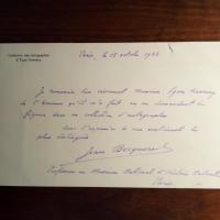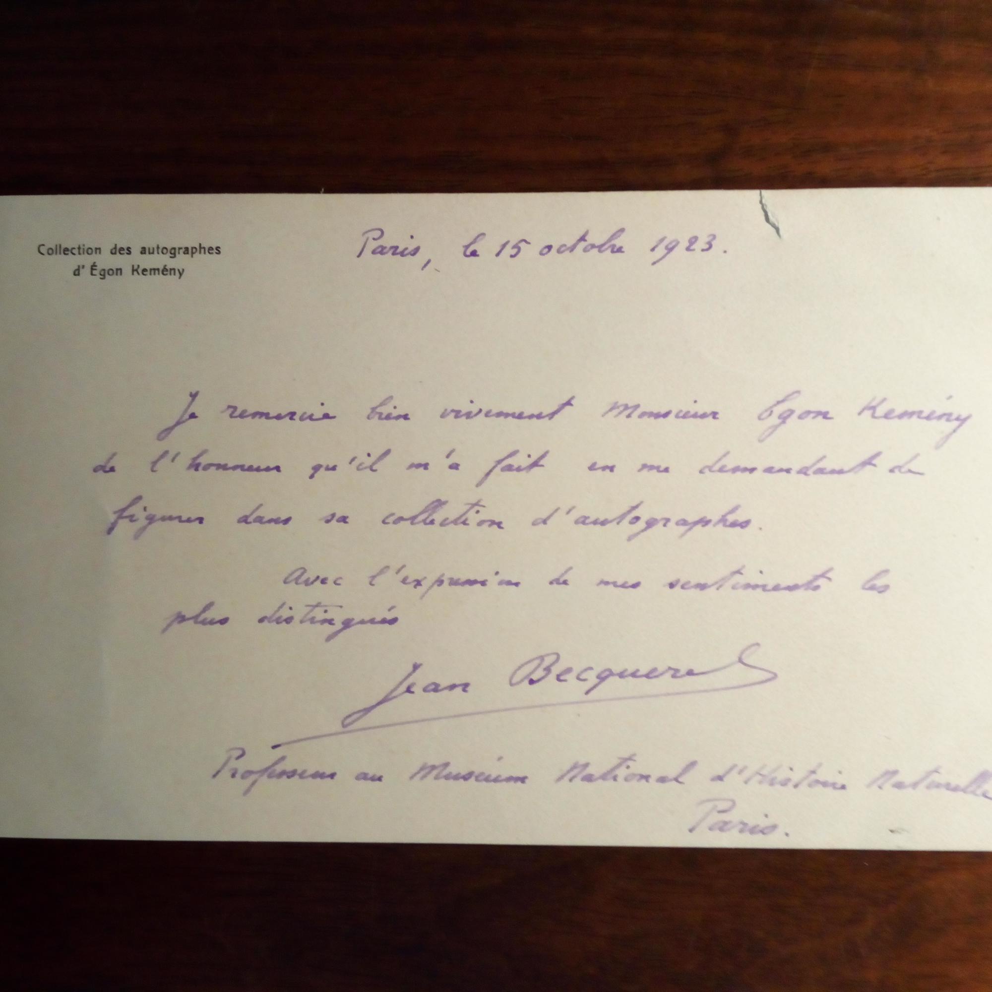 1878-1953, frz. Physiker, Sohn von Henri B. - Schöne e. Br.karte m. U. (als "Professeur au Muséum National d'histoire naturelle"), Paris 15.10.1923, 1 S. An den Sammler Égon Kemény" (1905-69), ungar. Dirigent, Komponist u. Librettist) m. dessen Slg.br.kopf