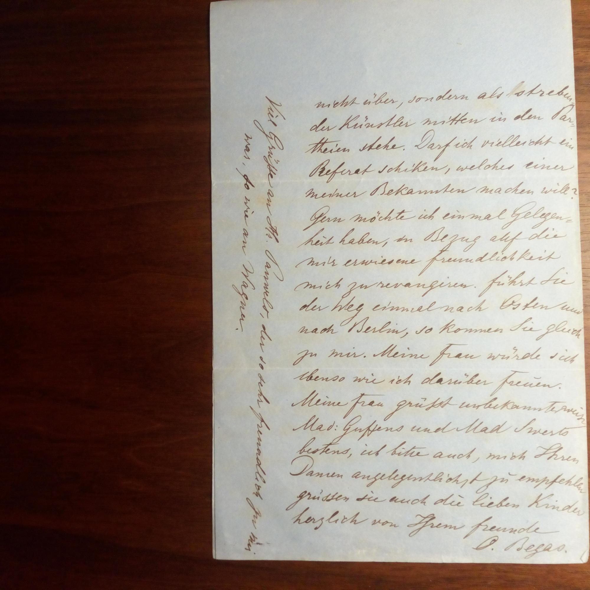 1828-83, Maler - E. Br. m. U., Berlin 20.9.1860, 4 S. 8°, etw. fleckig. Dankschreiben an Freunde in Antwerpen nach seiner Rück-kehr von dort, über eine Ausst. in Berlin u.a. Beiliegt frz. Übers.