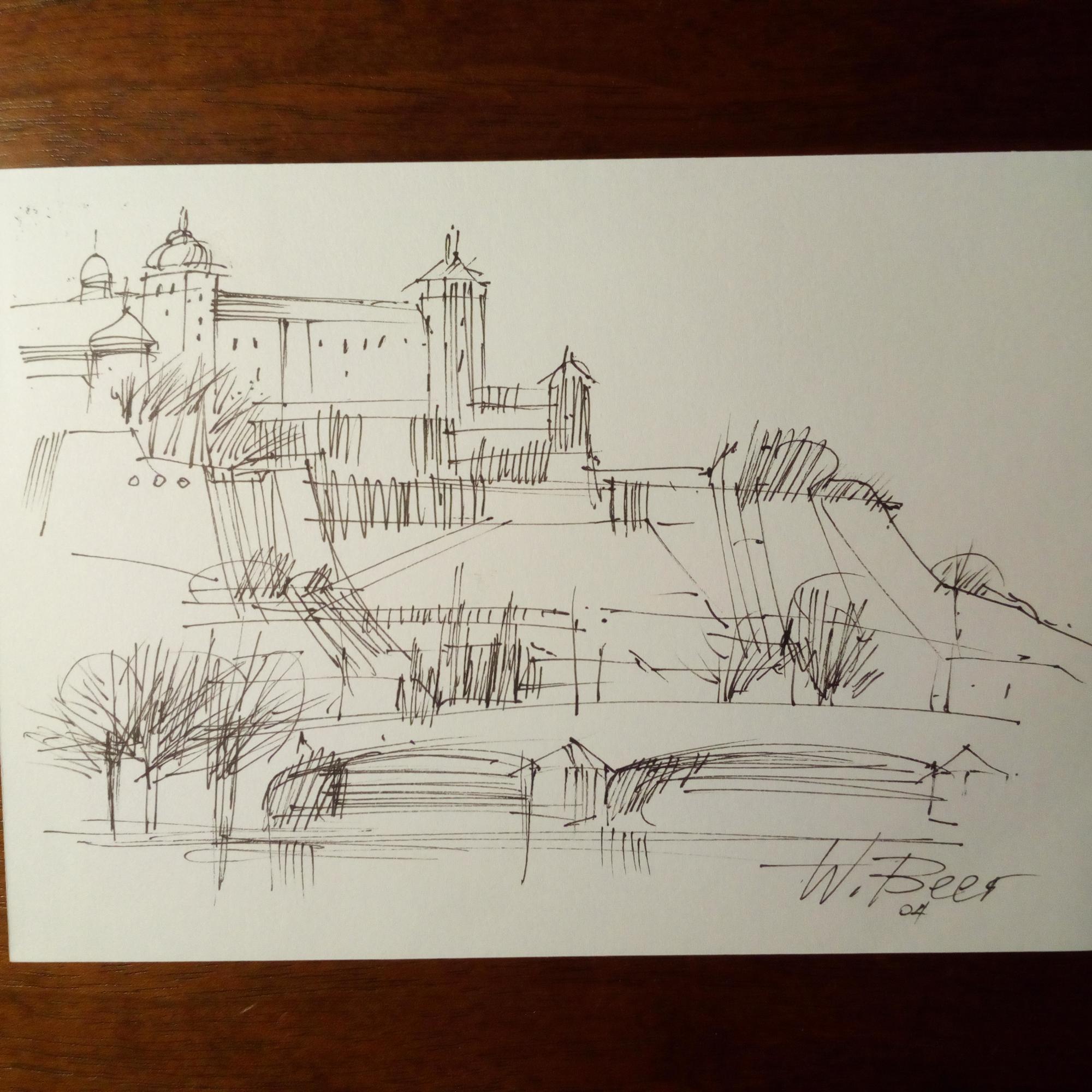 1929-2018, Würzburger Maler und Grafiker - Karte mit e. Federzeichnung der Festung mit Main, mit U. Als e. postal. Postkarte, Würzburg 28.11.2004.