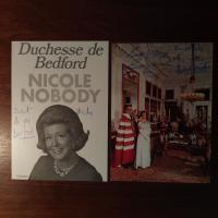 geb. Russel, 1920-2012, Duchesse und frz. Fernseh-Produzentin - Werbekarte (mit Pfo.) für ihre Autobiographie "Nicole Nobody" (1974) mit Widm. und U. ("M. de Bedford").