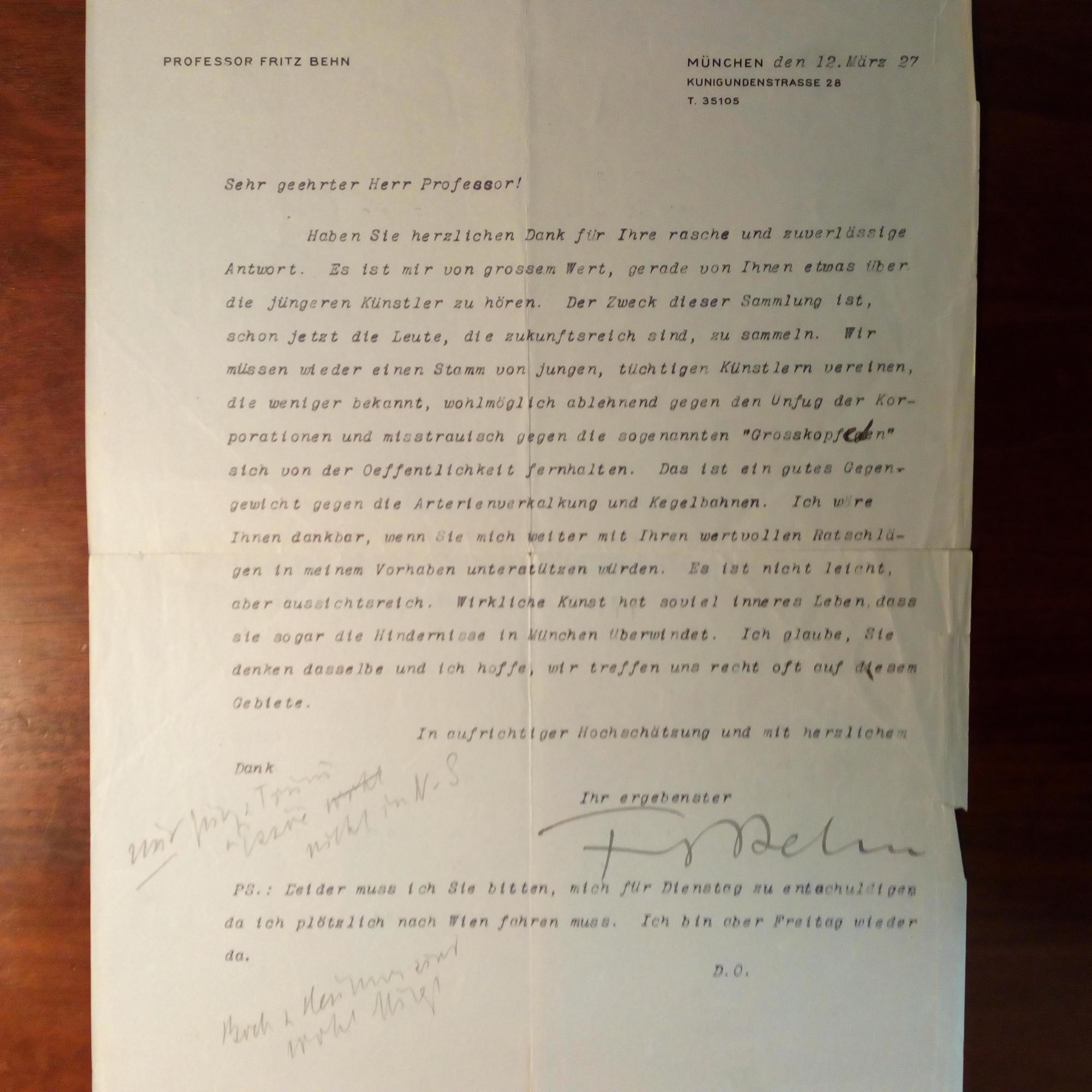 1879-1970, Bildhauer - Brief mit U., München 12.3.1927, 1 S. 4°, Briefkopf, Vermerke, kl. Altersspuren. An einen Akademie-Kollegen: ...wieder einen Stamm von ...Künstlern vereinen, der weniger bekannt, wohlmöglich ablehnend gegen den Unfug der Korporation und misstrauisch gegen die sogenannten "Großkopferten" sich von der Oeffentlichkeit fernhalten...Wirkliche Kunst hat so viel inneres Leben, dass sie sogar die Hindernisse in München überwindet...