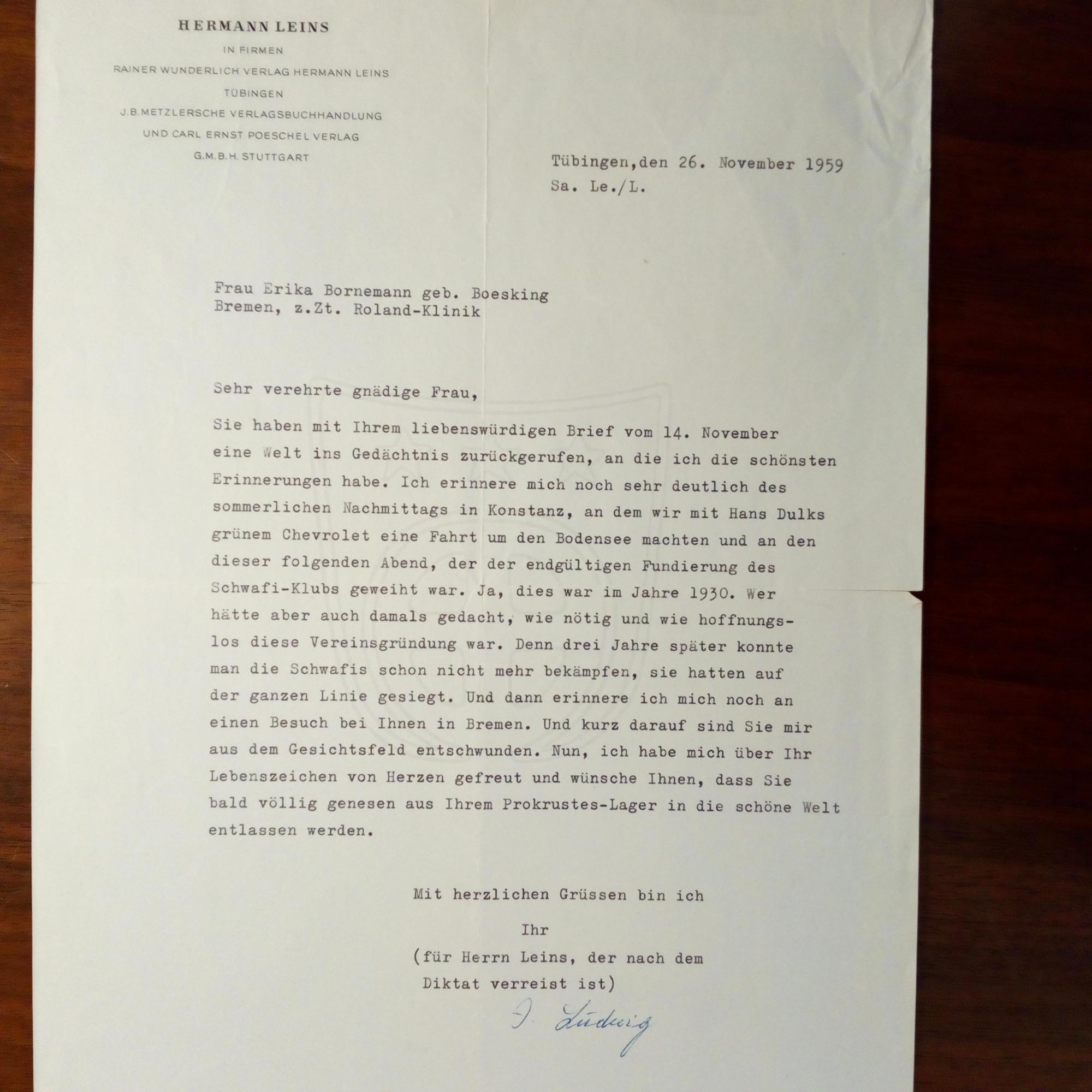 1899-1977, Verleger - Brief in seinem Namen mit U. des Sekretärs J. Ludwig, Tübingen 26.11.1959, 1 S. 4°, Br.kopf des Verl. An Frau Bornemann, Bremen: ...erinnere mich...des sommerlichen Nachmittags in Konstanz, an dem wir mit Dulks grünem Chevrolet eine Fahrt um den Bodensee machten und an den dieser folgenden Abend, der der endgültigen Fundierung des Schwafi-Klubs geweiht war...dann erinnere ich mich noch an einen Besuch bei Ihnen..