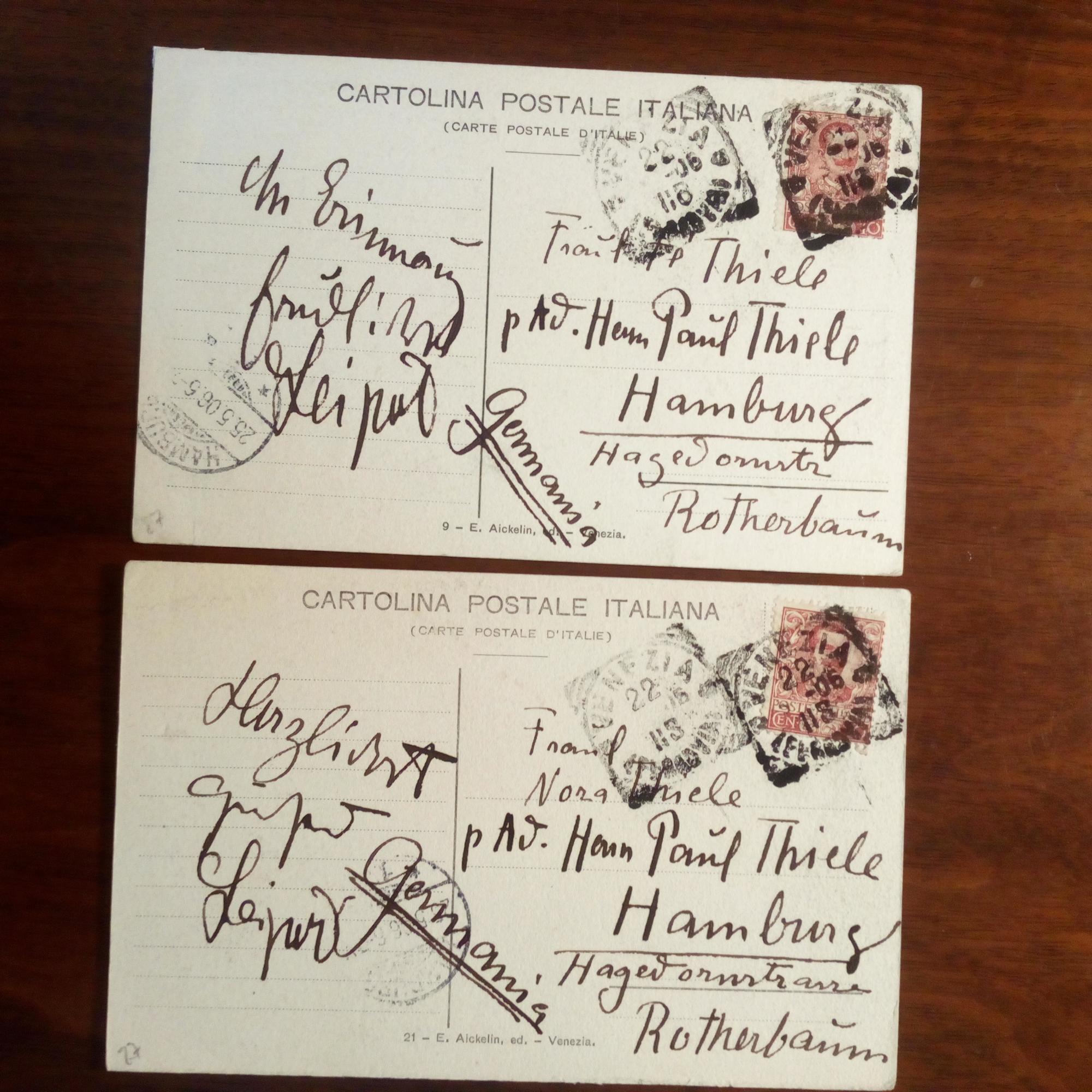 1864-1943, Reisender und Maler - 2 e. postal. Ansichts-karten (Venedig), beide m. U., Venedig 22.5.1906, kl. Mont.spur. Grüße für den Hamburger Bauunternehmer Paul Thiele (1877-1968) u. Gattin.