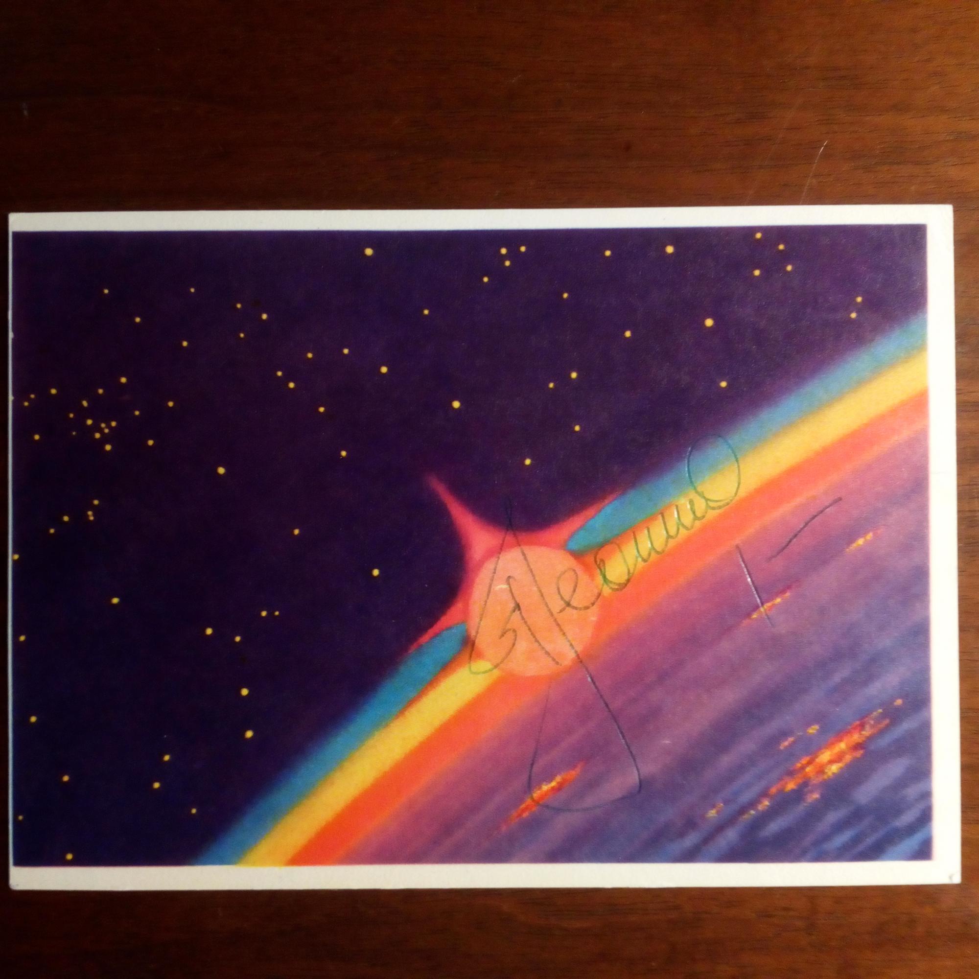 1934-2019, russ. Kosmonaut (1. "Raumspaziergang") - Kunst-Ansichtskarte (nach seinem Gemälde der hinter der Erde aufgeh. Sonne) mit U. Beiliegt kl. Blatt mit späterer U. (ger. Wischspur).